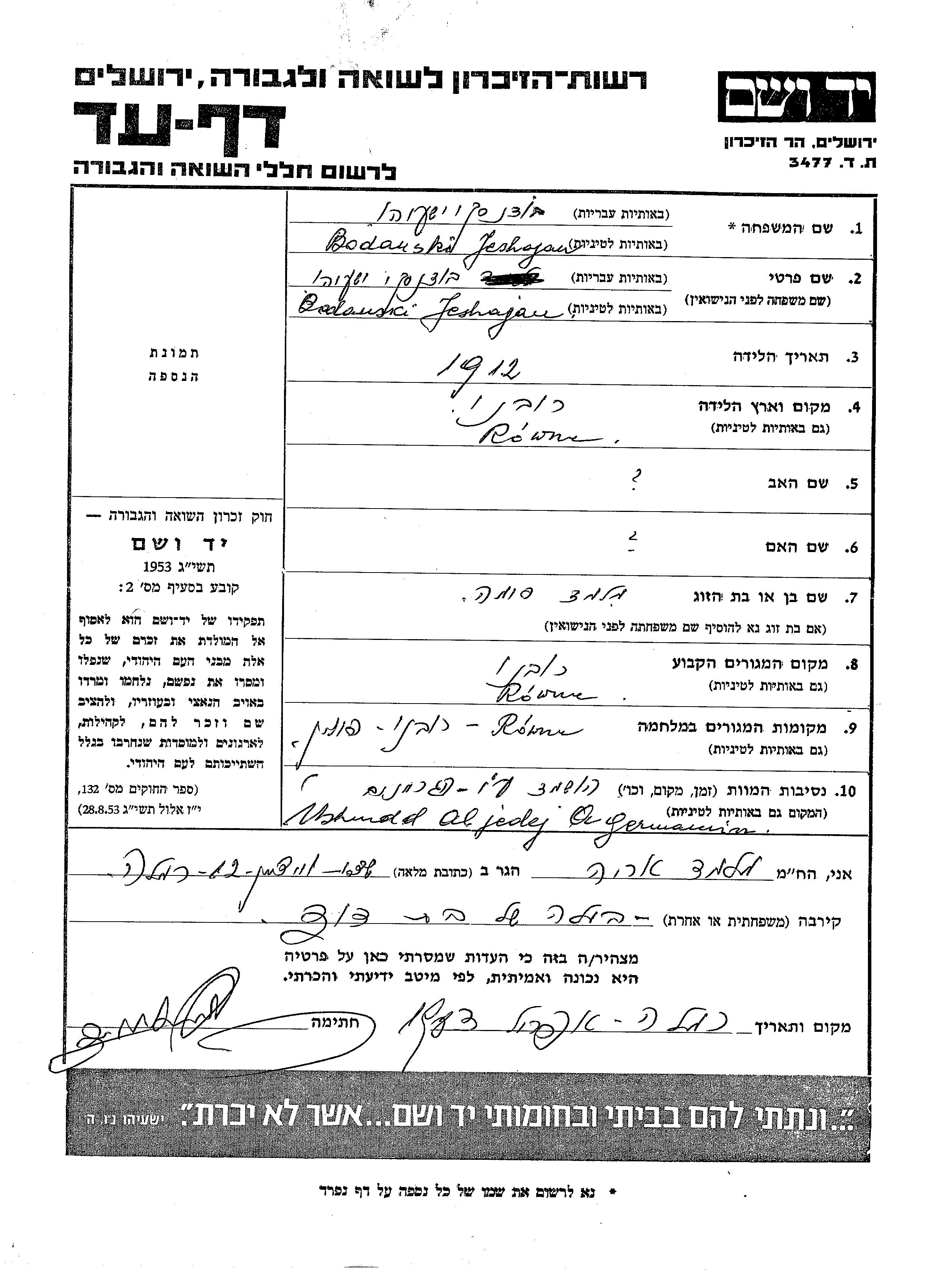 Jeshajau Bodanski wurde im Jahr 1912 in Rowno, Polen geboren. Er war mit Sima, geb. Melamed Verheiratet. Vor dem Zweiten Weltkrieg lebte er in Rowno, Polen. Während des Krieges war er in Rowno, Polen.