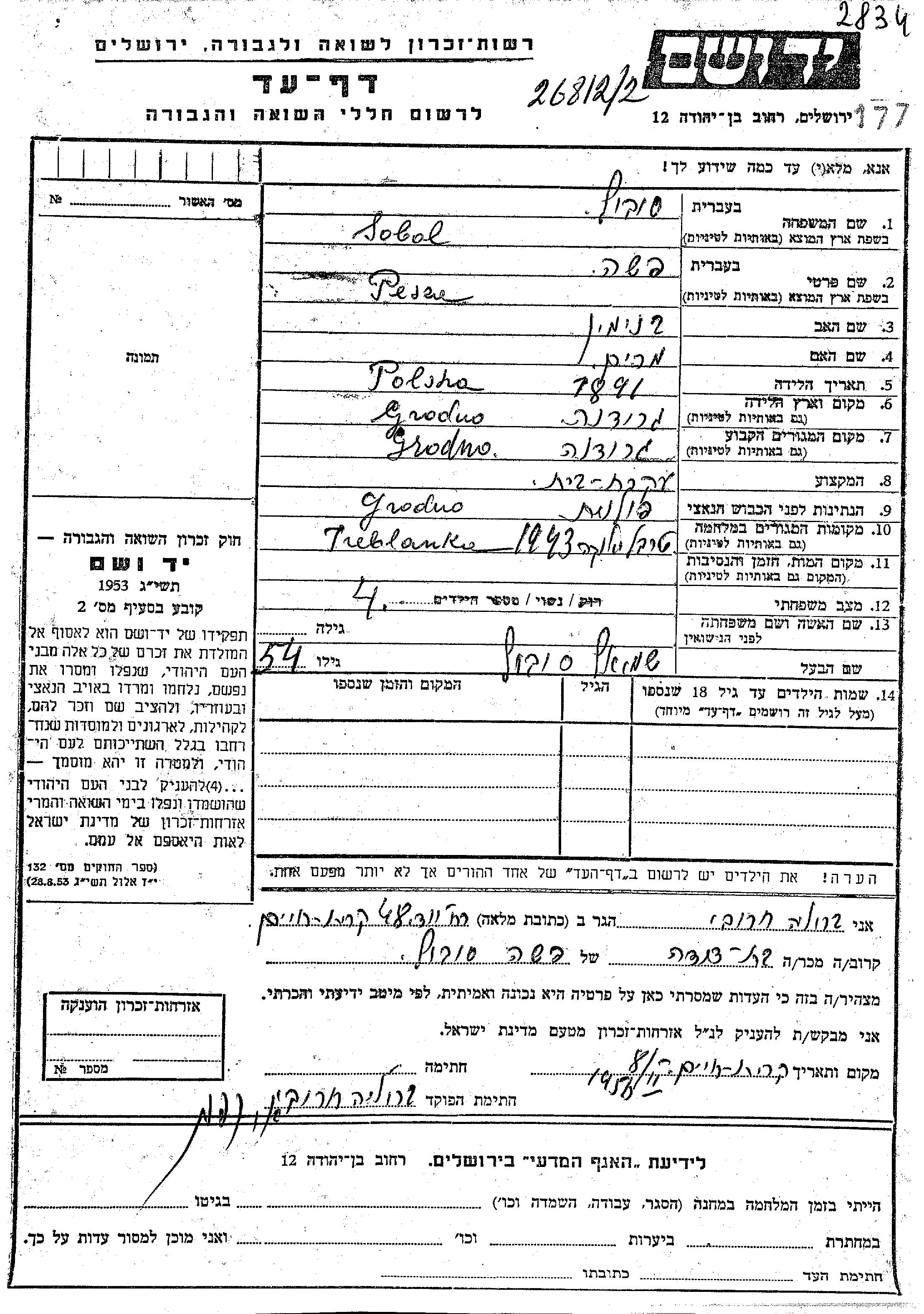 Pesze Sobol wurde im Jahr 1891 in Grodno, Polen geboren. Sie war die Tochter von Beniamin und Miriam. Sie war Hausfrau und mit Shmuel Verheiratet. Vor dem Zweiten Weltkrieg lebte sie in Grodno, Polen. Während des Krieges war sie in Grodno, Polen.