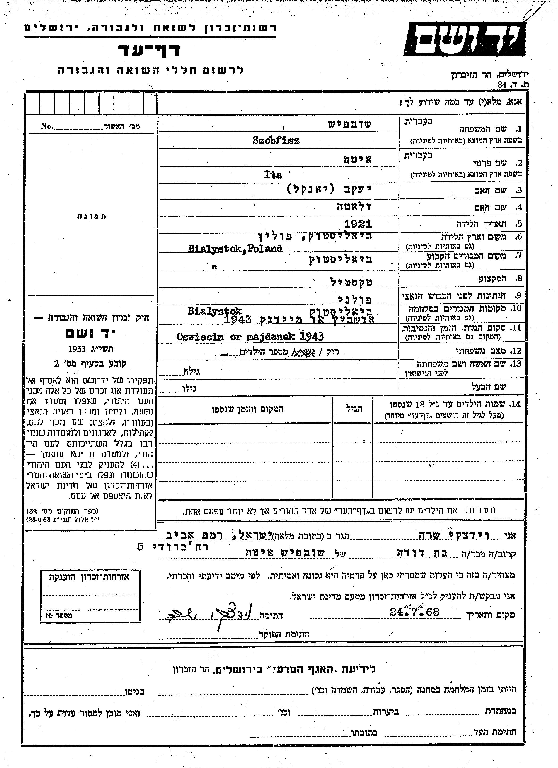 Szobfisz Ita 1921 Bialystok, Polen Gedenkblatt