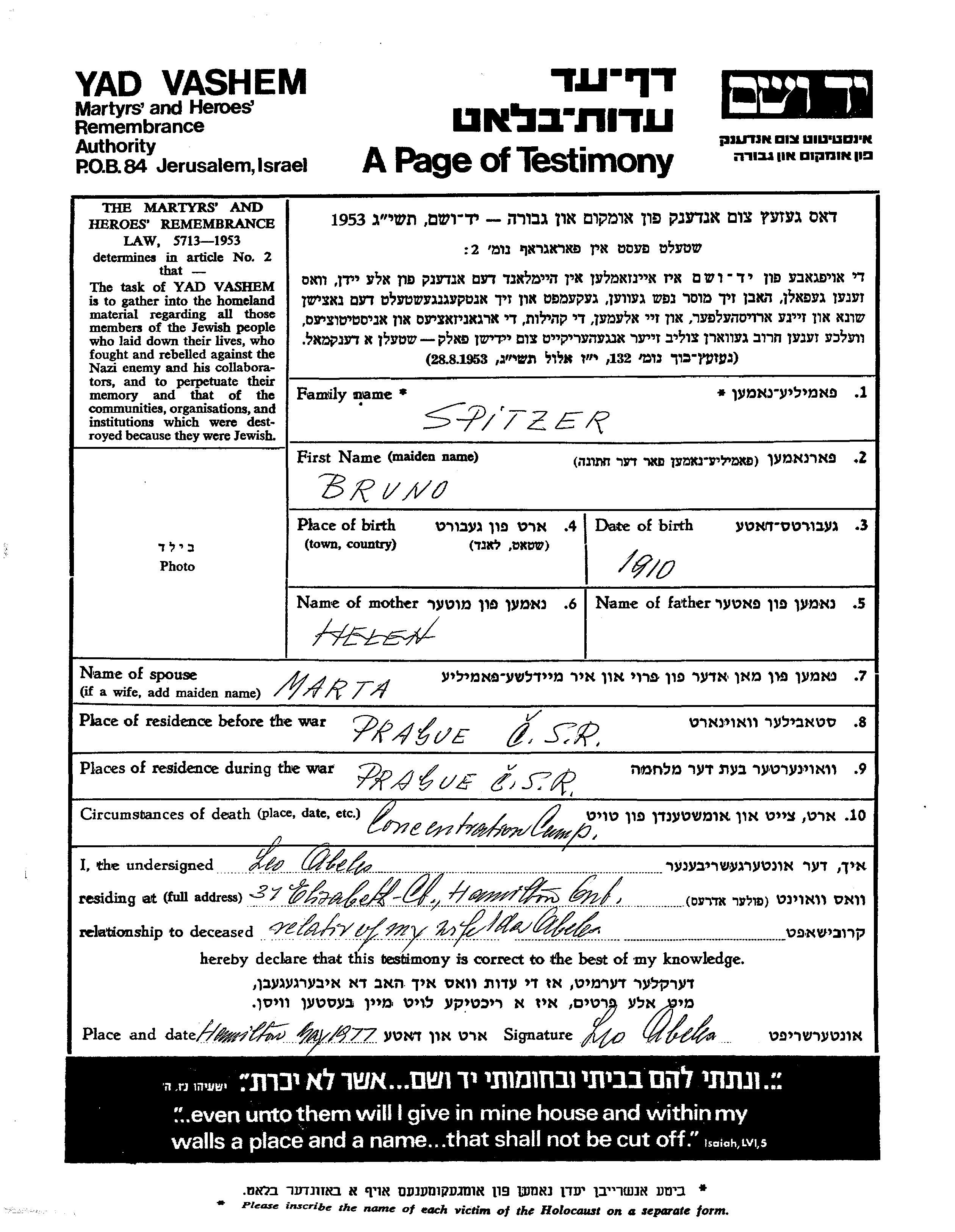 Bruno Spitzer wurde im Jahr 1910 geboren. Er war der Sohn von Helen. Er war mit Marta Verheiratet. Vor dem Zweiten Weltkrieg lebte er in Prague, Tschechoslowakei. Während des Krieges war er in Prague, Tschechoslowakei.