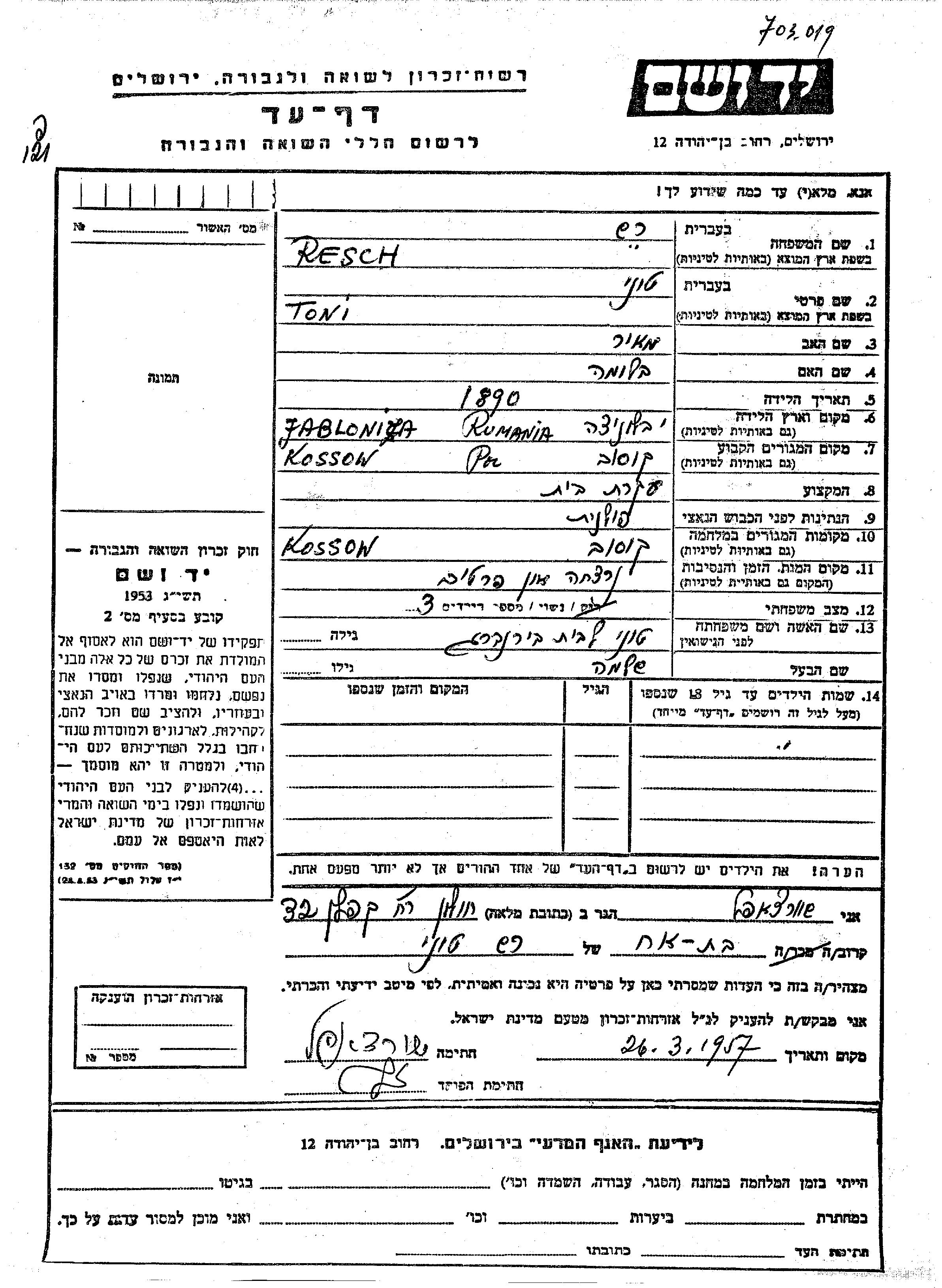 Toni Resch Rash, geb. Birnberg wurde im Jahr 1890 in Jabloniza, Rumänien geboren. Sie war die Tochter von Meir und Bluma. Sie war Hausfrau und mit Shlomo Verheiratet. Vor dem Zweiten Weltkrieg lebte sie in Kossow, Polen. Während des Krieges war sie in Kosow, Polen.