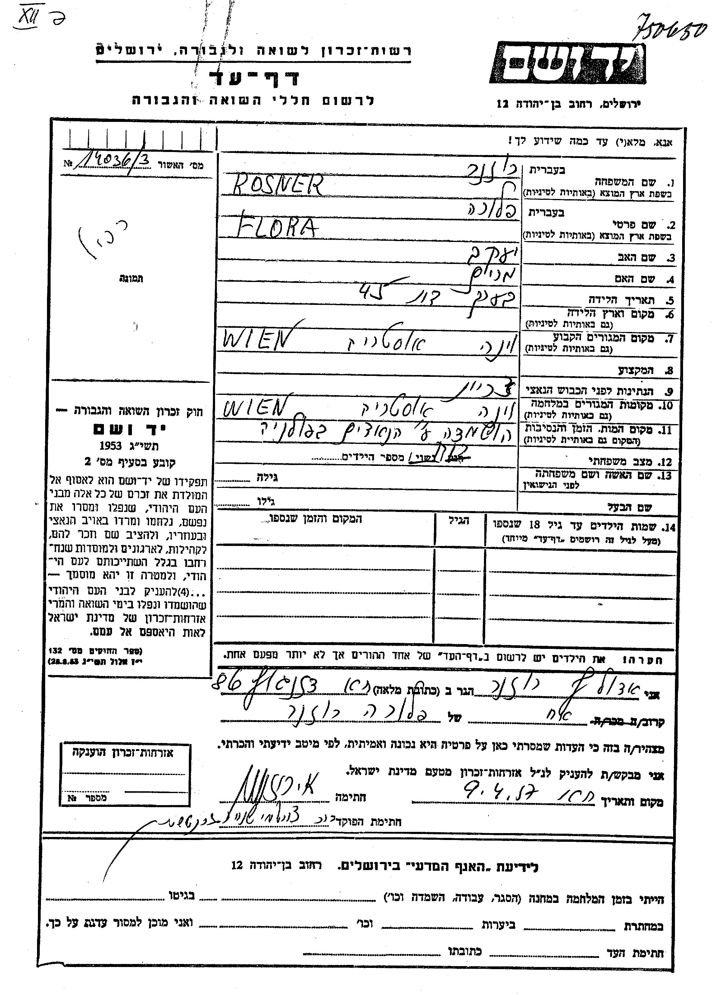 Flora Rosner wurde Sie war die Tochter von Yaakov und Miriam. Sie war Ledig. Vor dem Zweiten Weltkrieg lebte sie in Wien, Österreich. Während des Krieges war sie in Wien, Österreich.