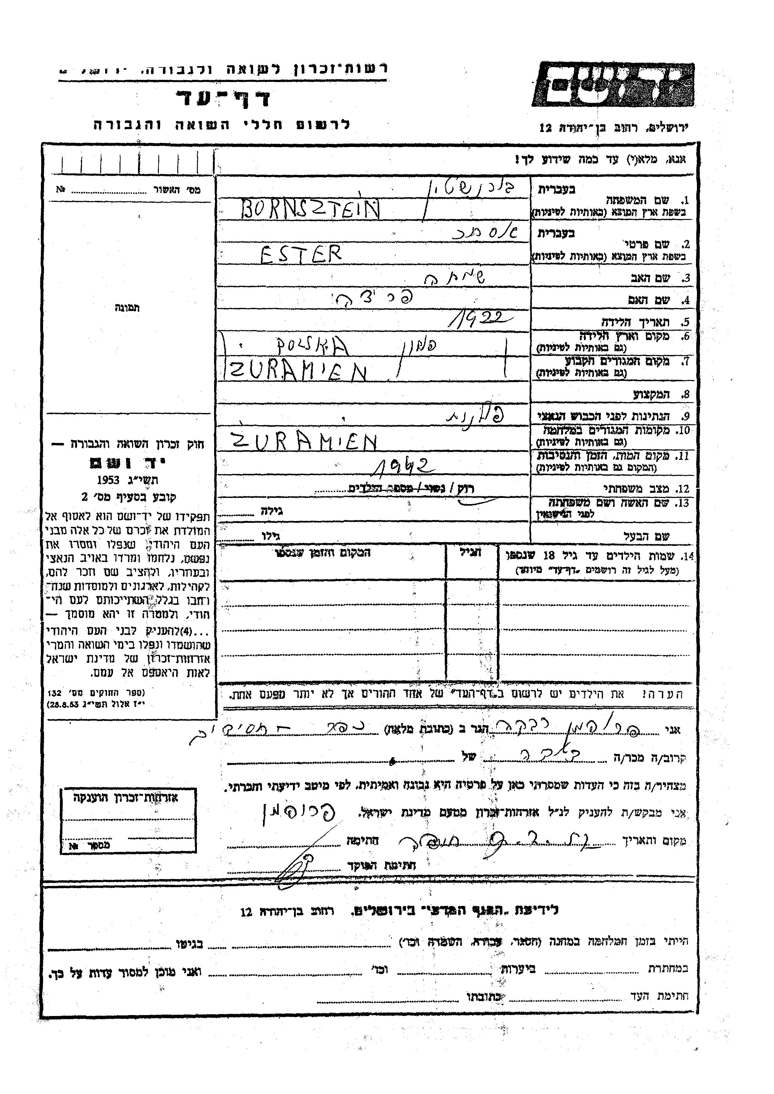 Ester Bornsztein wurde im Jahr 1922 in Zuramien, Polen geboren. Sie war die Tochter von Simkha und Frida. Sie war Ledig. Vor dem Zweiten Weltkrieg lebte sie in Zuramien, Polen. Während des Krieges war sie in Zuramien, Polen.
