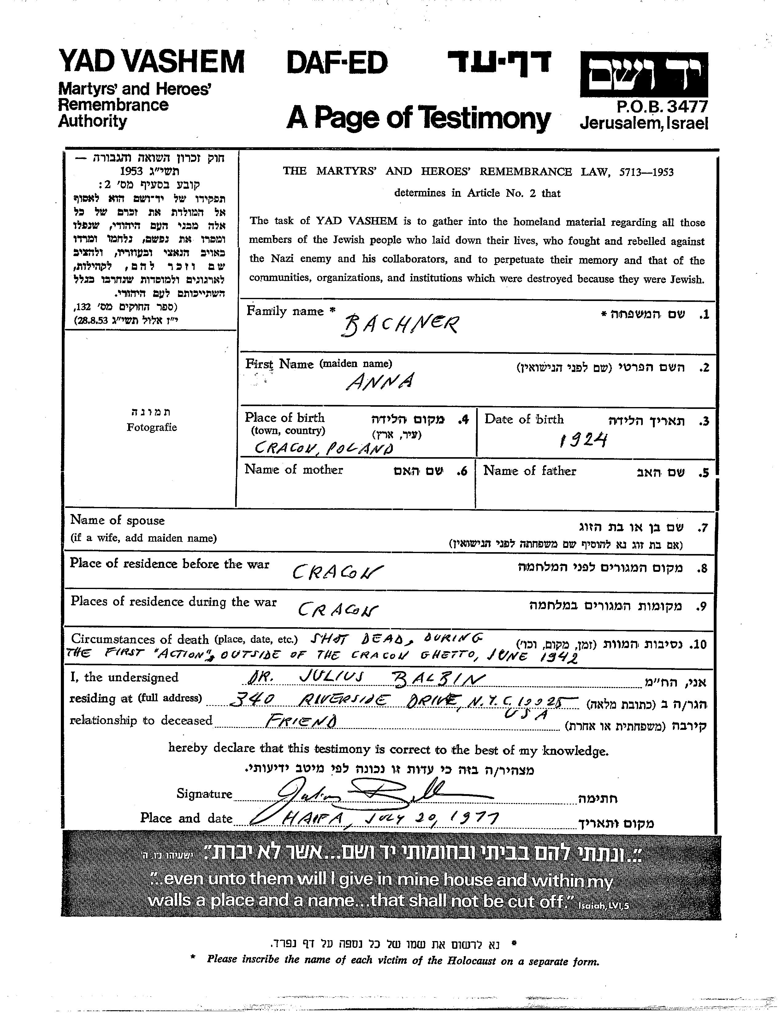 Anna Bachner wurde im Jahr 1924 in Cracow, Polen geboren. Vor dem Zweiten Weltkrieg lebte sie in Cracow, Polen. Während des Krieges war sie in Cracow, Polen.