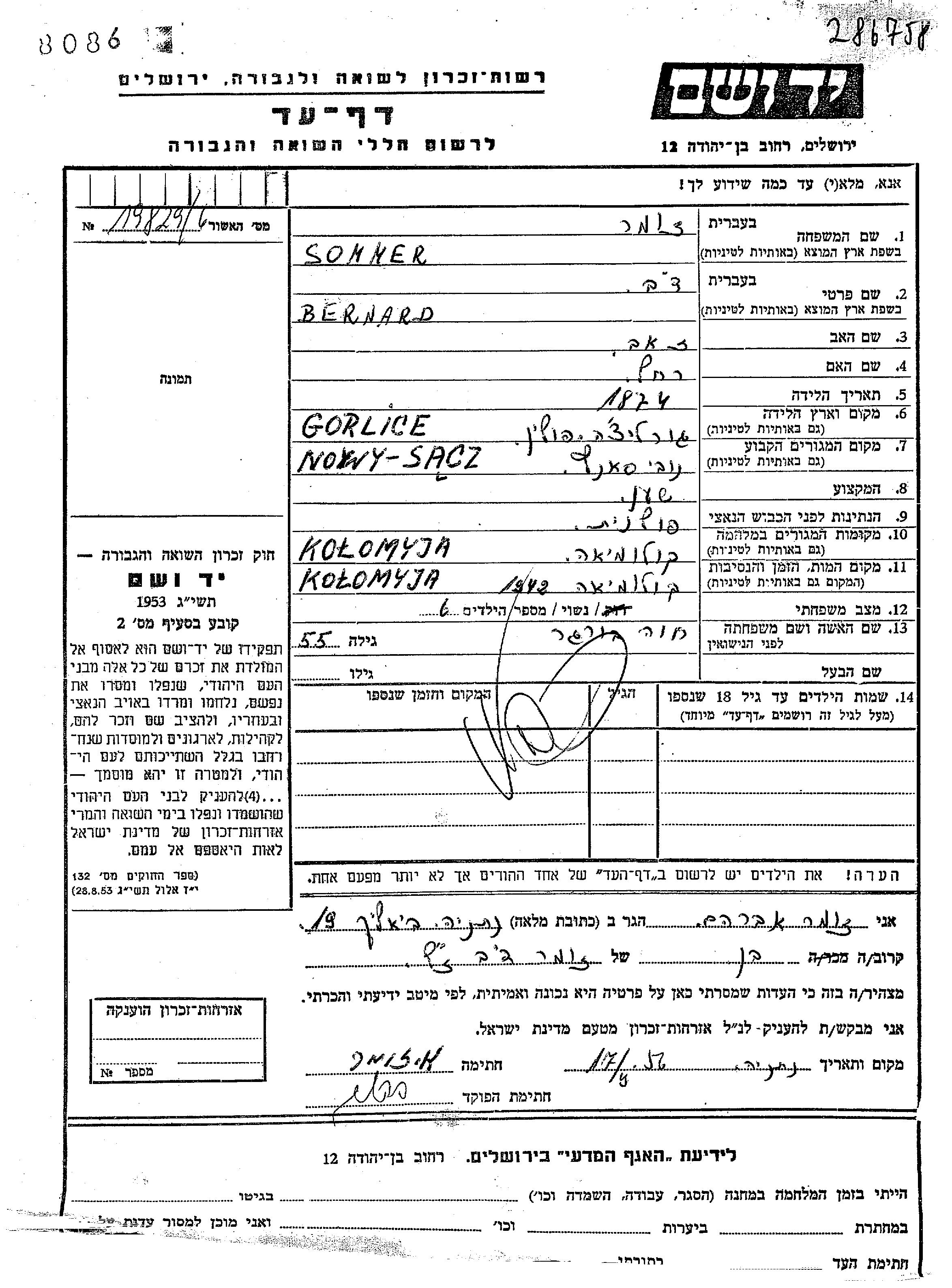 Bernard Dov Sommer wurde im Jahr 1874 in Gorlice, Polen geboren. Er war der Sohn von Zeev und Rakhel. Er war Uhrmacher/-in und mit Khaia, geb. Birger Verheiratet. Vor dem Zweiten Weltkrieg lebte er in Nowy Sacz, Polen. Während des Krieges war er in Kolomyja, Polen.