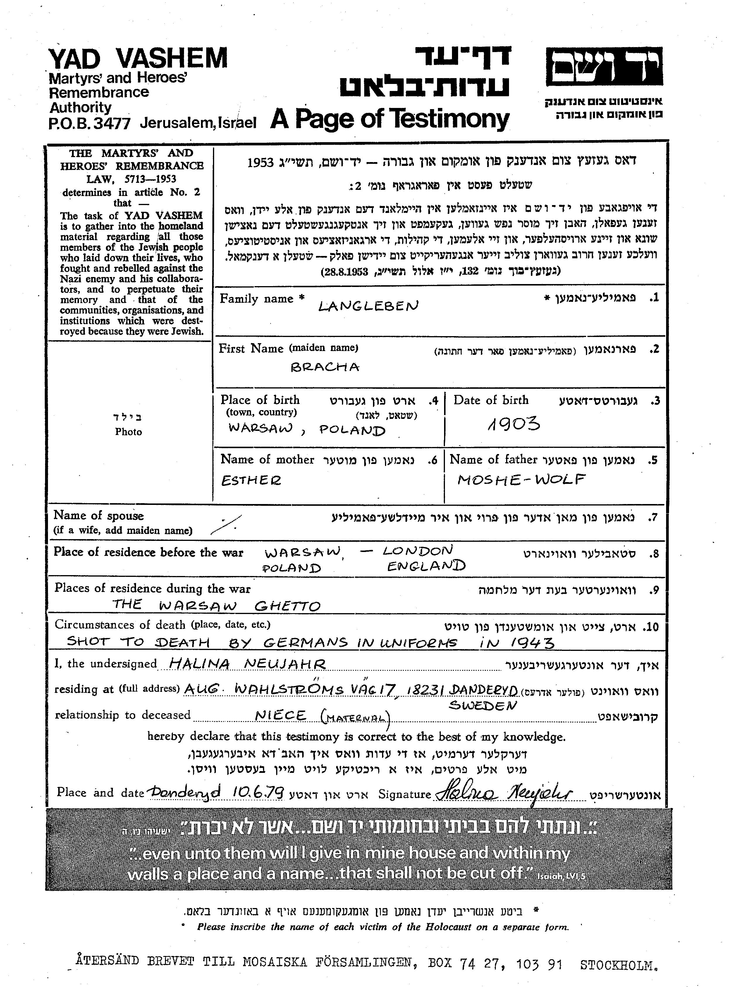 Bracha Langleben wurde im Jahr 1903 in Warsaw, Polen geboren. Sie war die Tochter von Moshe Wolf und Esther. Vor dem Zweiten Weltkrieg lebte sie in London, Großbritannien. Während des Krieges war sie in Warsaw, Polen.