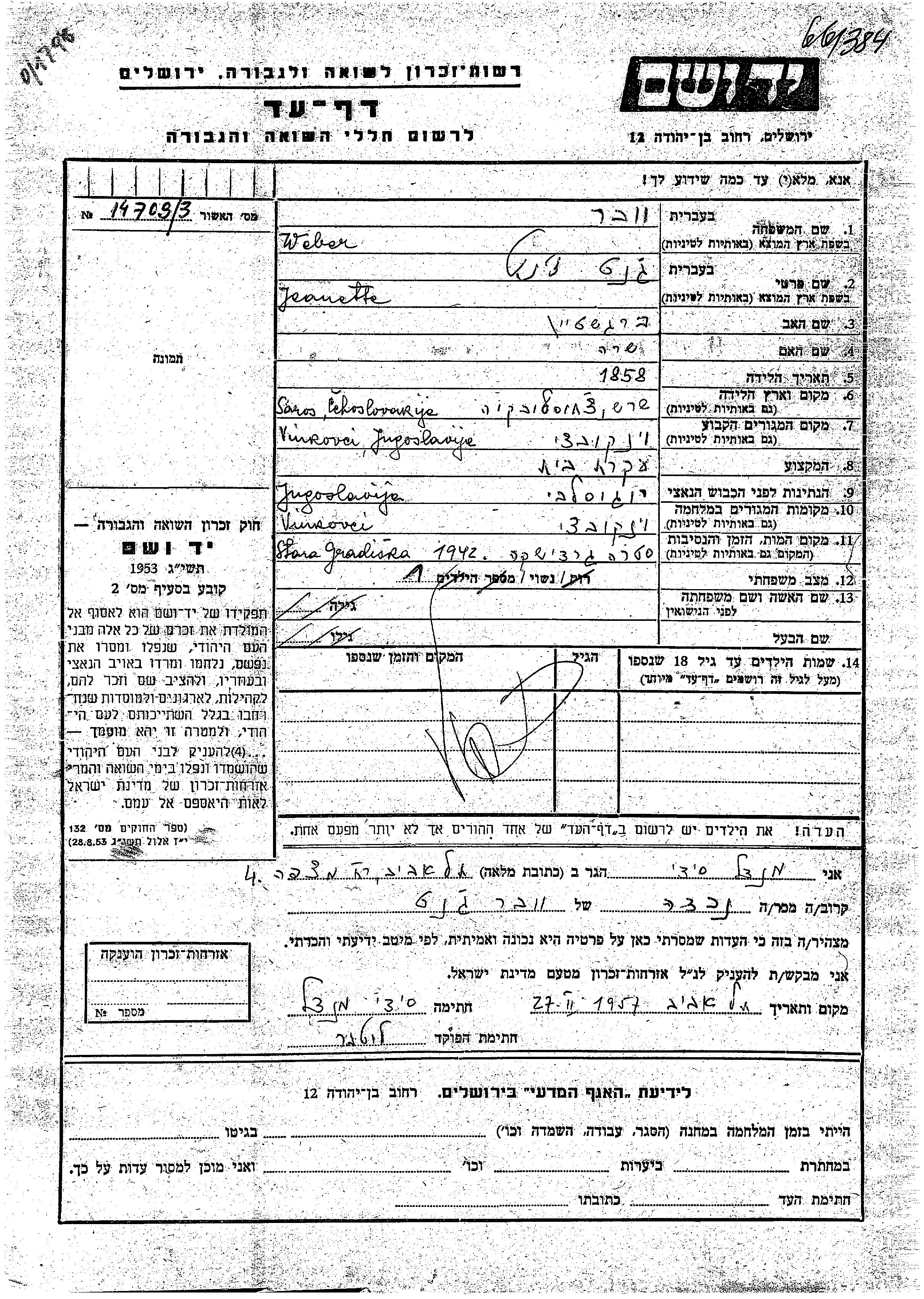 Jeanette Weber, geb. Bergshtein wurde im Jahr 1858 in Saros, Tschechoslowakei geboren. Sie war die Tochter von Sara. Sie war Hausfrau und Verheiratet. Vor dem Zweiten Weltkrieg lebte sie in Vinkovci, Jugoslawien. Während des Krieges war sie in Vinkovci, Jugoslawien.