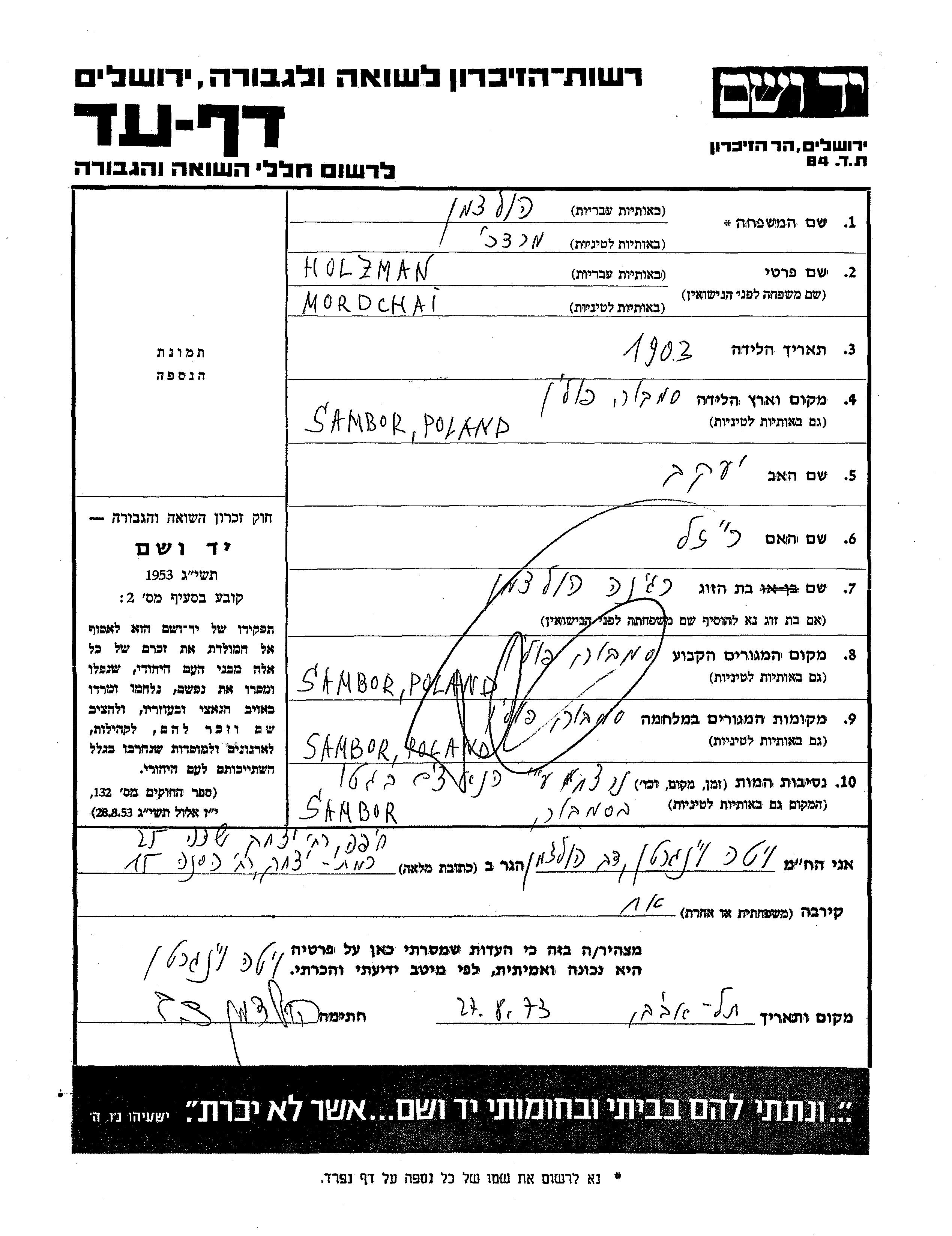 Mordchai Holzman wurde im Jahr 1903 in Sambor, Polen geboren. Er war der Sohn von Yaakov und Reizl. Er war mit Regina Verheiratet. Vor dem Zweiten Weltkrieg lebte er in Sambor, Polen. Während des Krieges war er in Sambor, Polen.