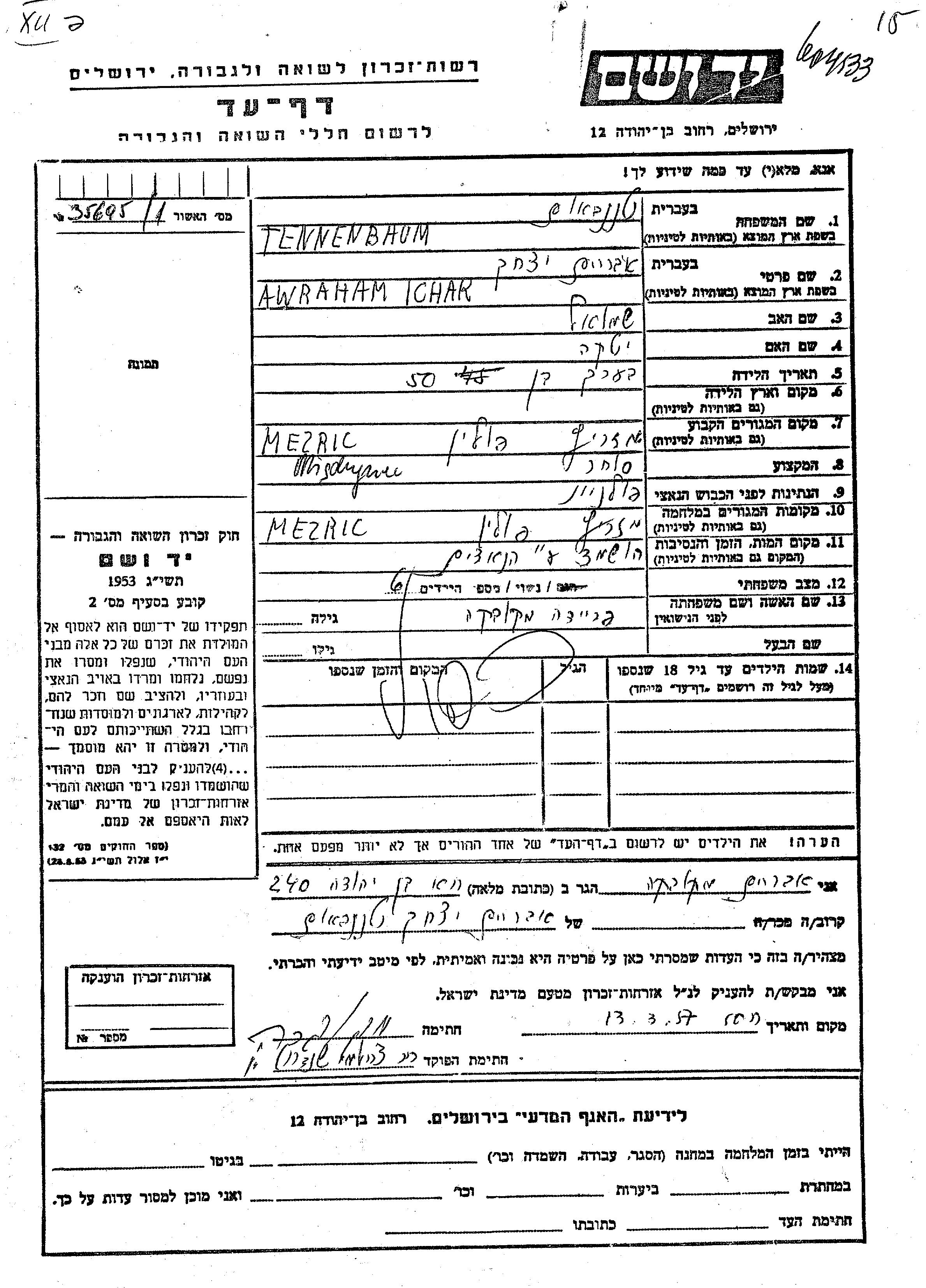 Awraham Ichak Tennenbaum wurde Er war der Sohn von Shmuel und Itka. Er war Kaufmann/-frau und mit Freida, geb. Makovka Verheiratet. Vor dem Zweiten Weltkrieg lebte er in Miedzyrzec, Polen. Während des Krieges war er in Miedzyrzec, Polen.