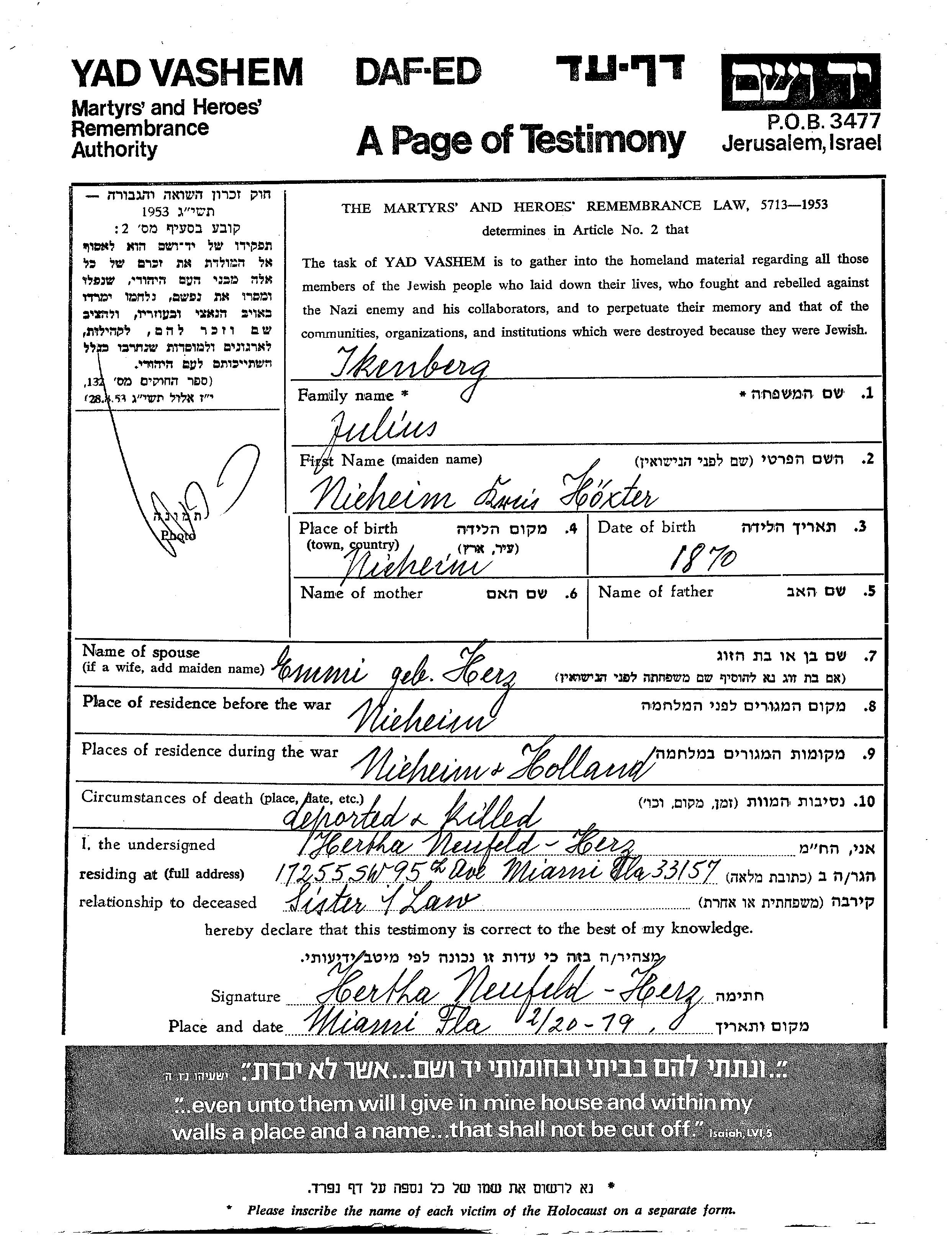 Julius Ikenberg wurde im Jahr 1870 in Nieheim, Deutsches Reich geboren. Er war mit Emmi, geb. Herz Verheiratet. Vor dem Zweiten Weltkrieg lebte er in Nieheim, Deutsches Reich. Während des Krieges war er in Niederlande.