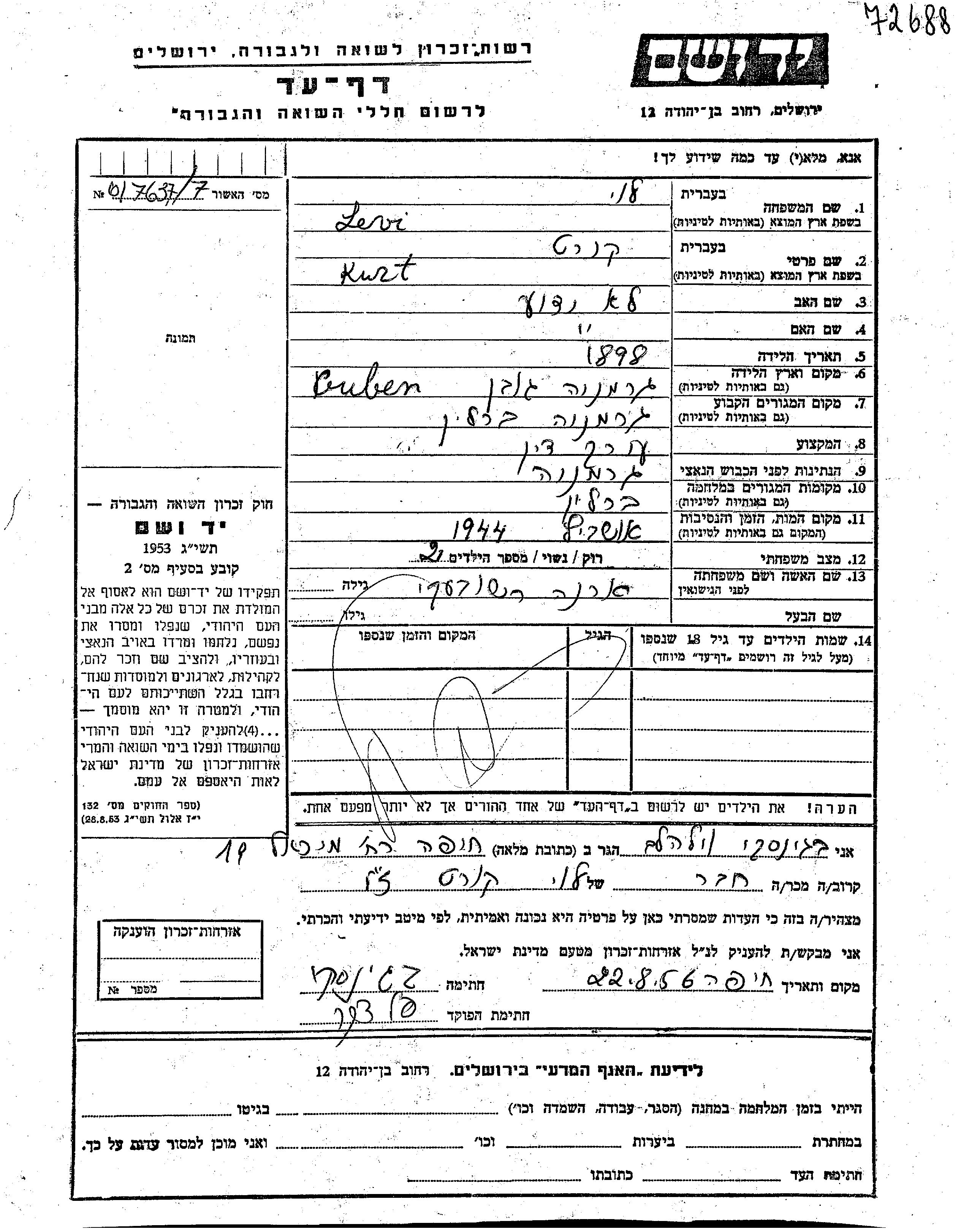 Kurt Levi wurde im Jahr 1898 in Guben, Deutsches Reich geboren. Er war Rechtsanwalt/rechtsanwältin und mit Erna, geb. Rashovski Verheiratet. Vor dem Zweiten Weltkrieg lebte er in Berlin, Deutsches Reich. Während des Krieges war er in Berlin, Deutsches Reich.
