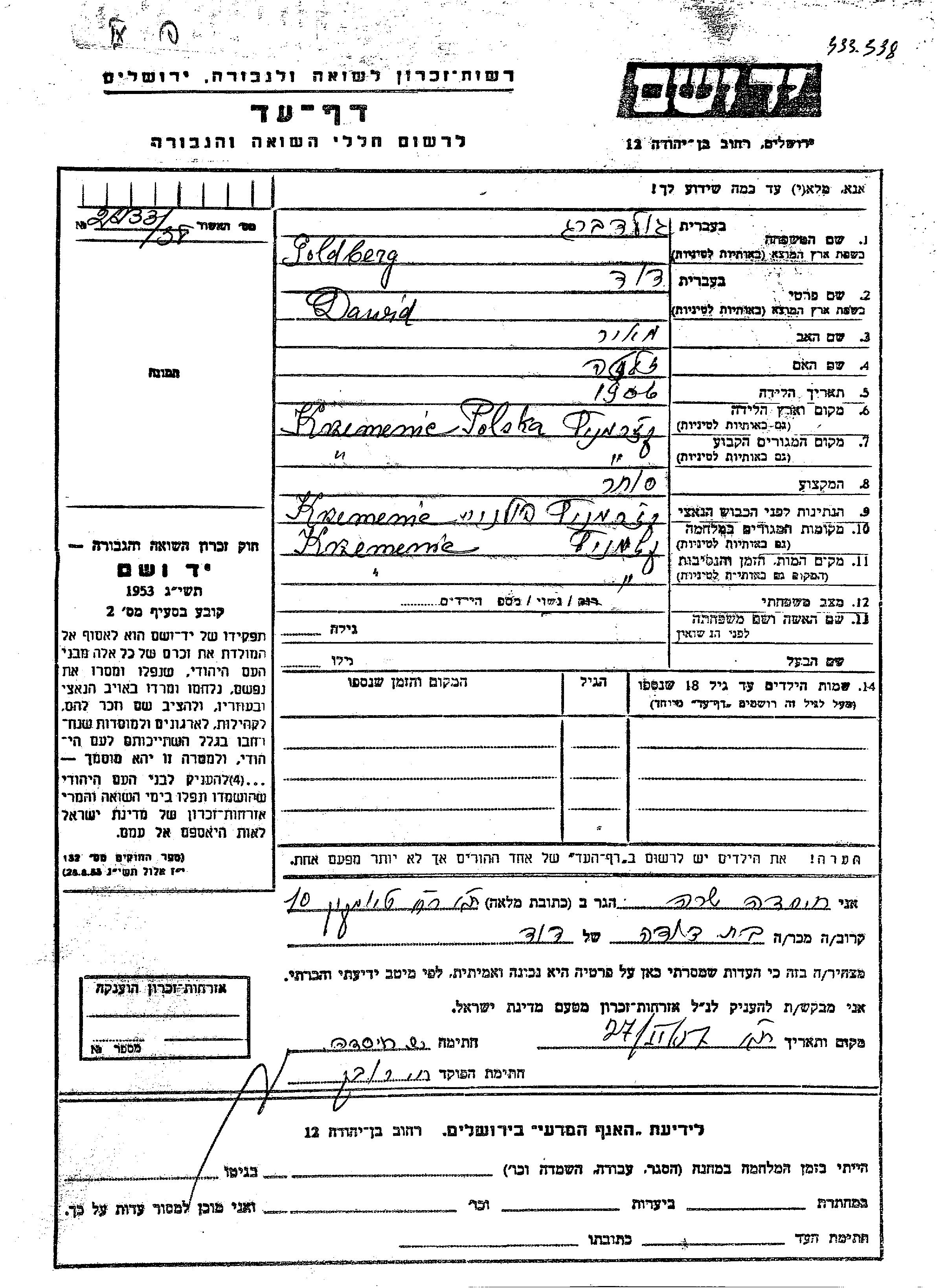 David wurde in der Schoah ermordet. Todesort: Kremenets.
