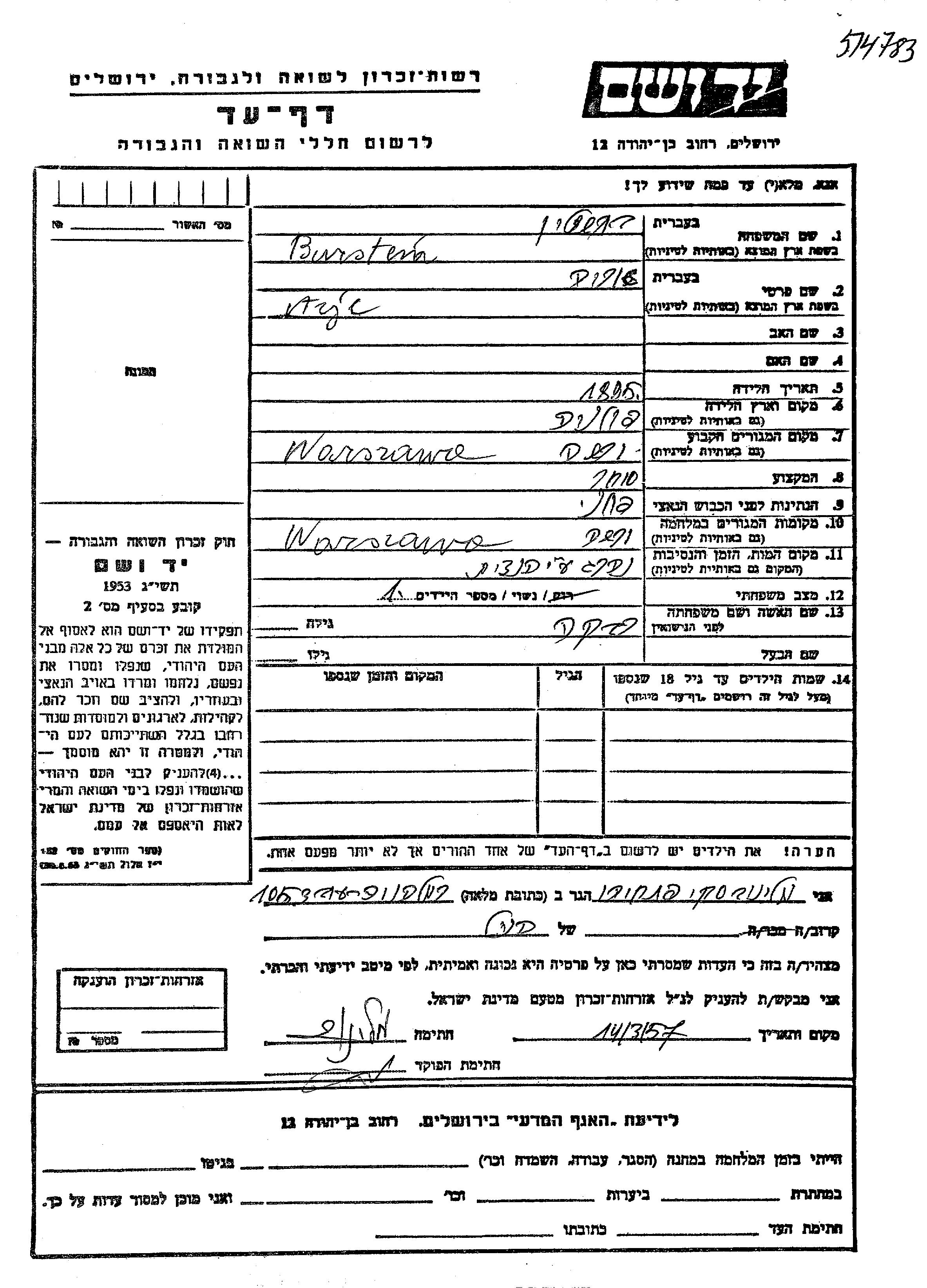 Arje Bursten wurde im Jahr 1895 in Polen geboren. Er war Kaufmann/-frau und mit Rivka Verheiratet. Vor dem Zweiten Weltkrieg lebte er in Warszawa, Polen. Während des Krieges war er in Warszawa, Polen.