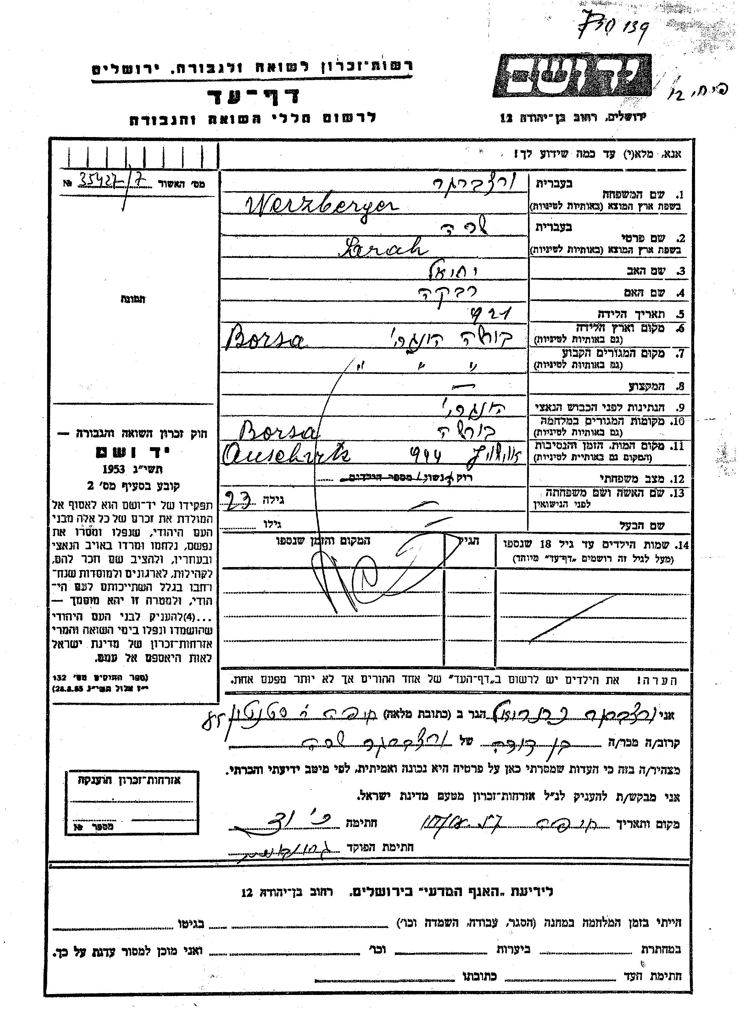 Werzberger Sarah 1921 Borsa, Rumänien Gedenkblatt