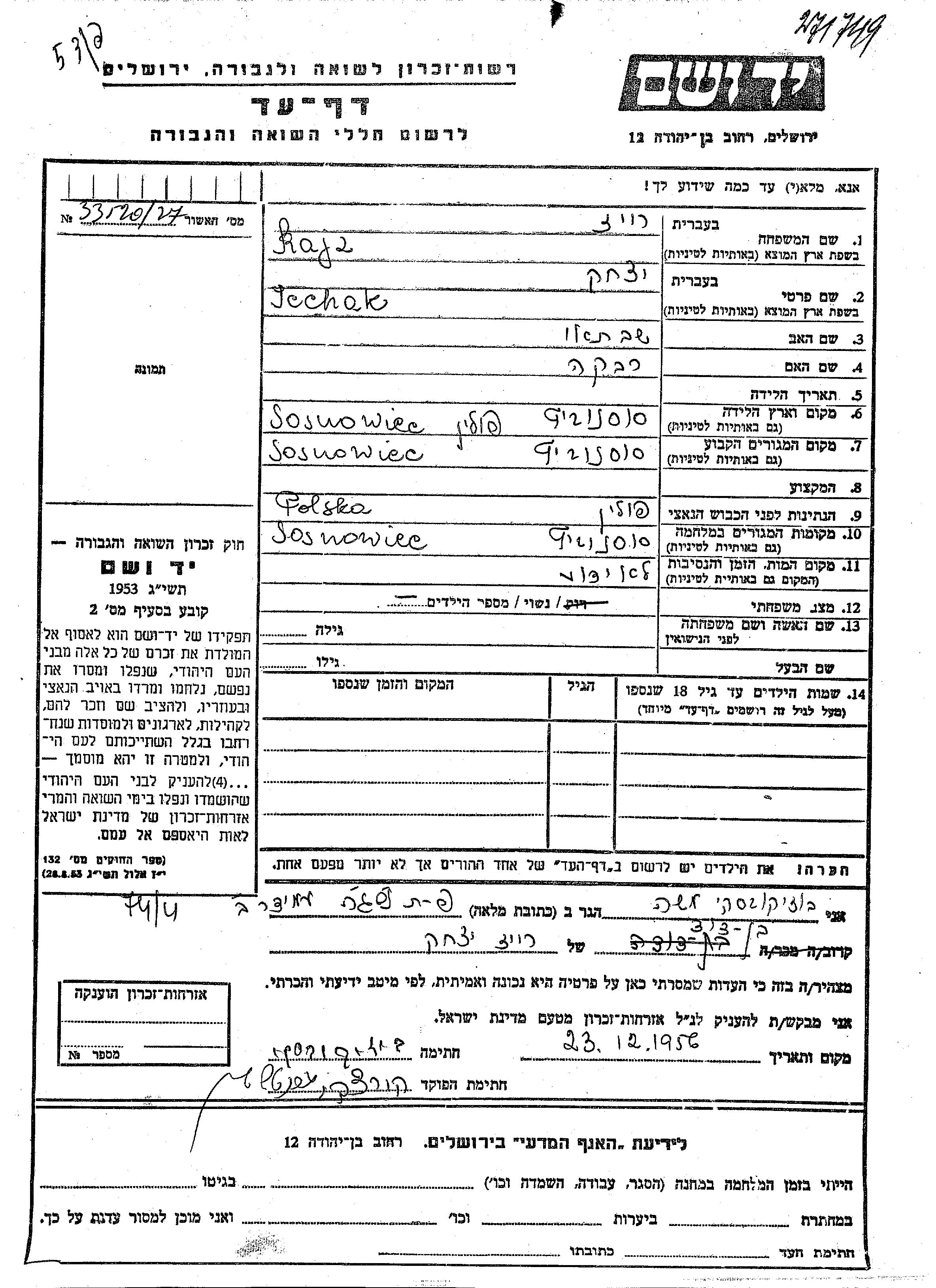 Rajz Icchak Sosnowiec, Polen Gedenkblatt