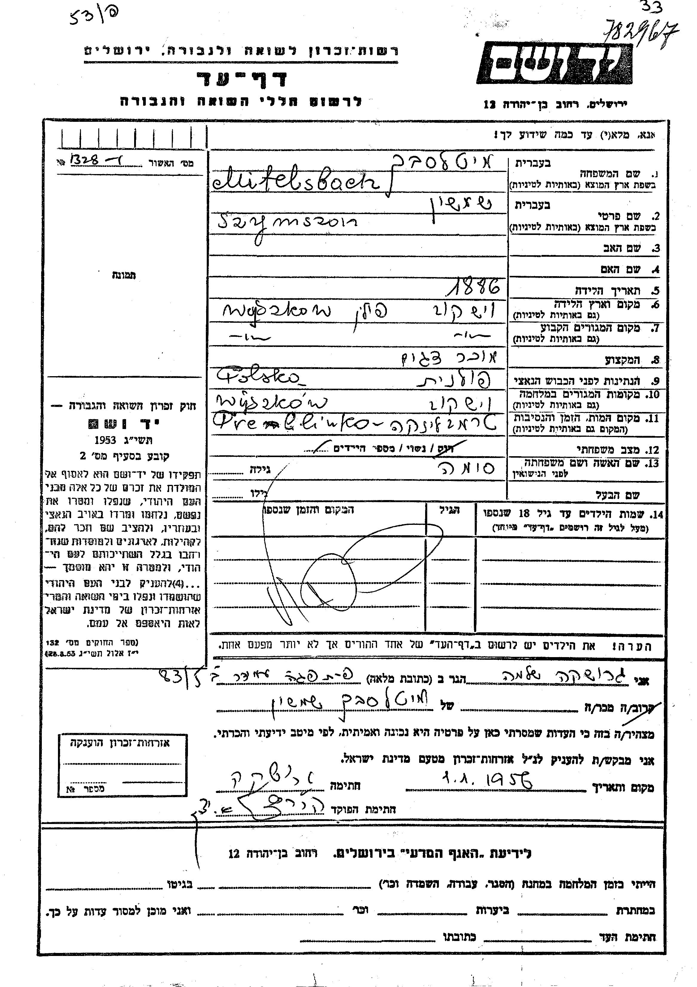 Szymszon Mitelsbach wurde im Jahr 1886 in Wyszkow, Polen geboren. Er war Fischverkäufer und mit Sima Verheiratet. Vor dem Zweiten Weltkrieg lebte er in Wyszkow, Polen. Während des Krieges war er in Wyszkow, Polen.
