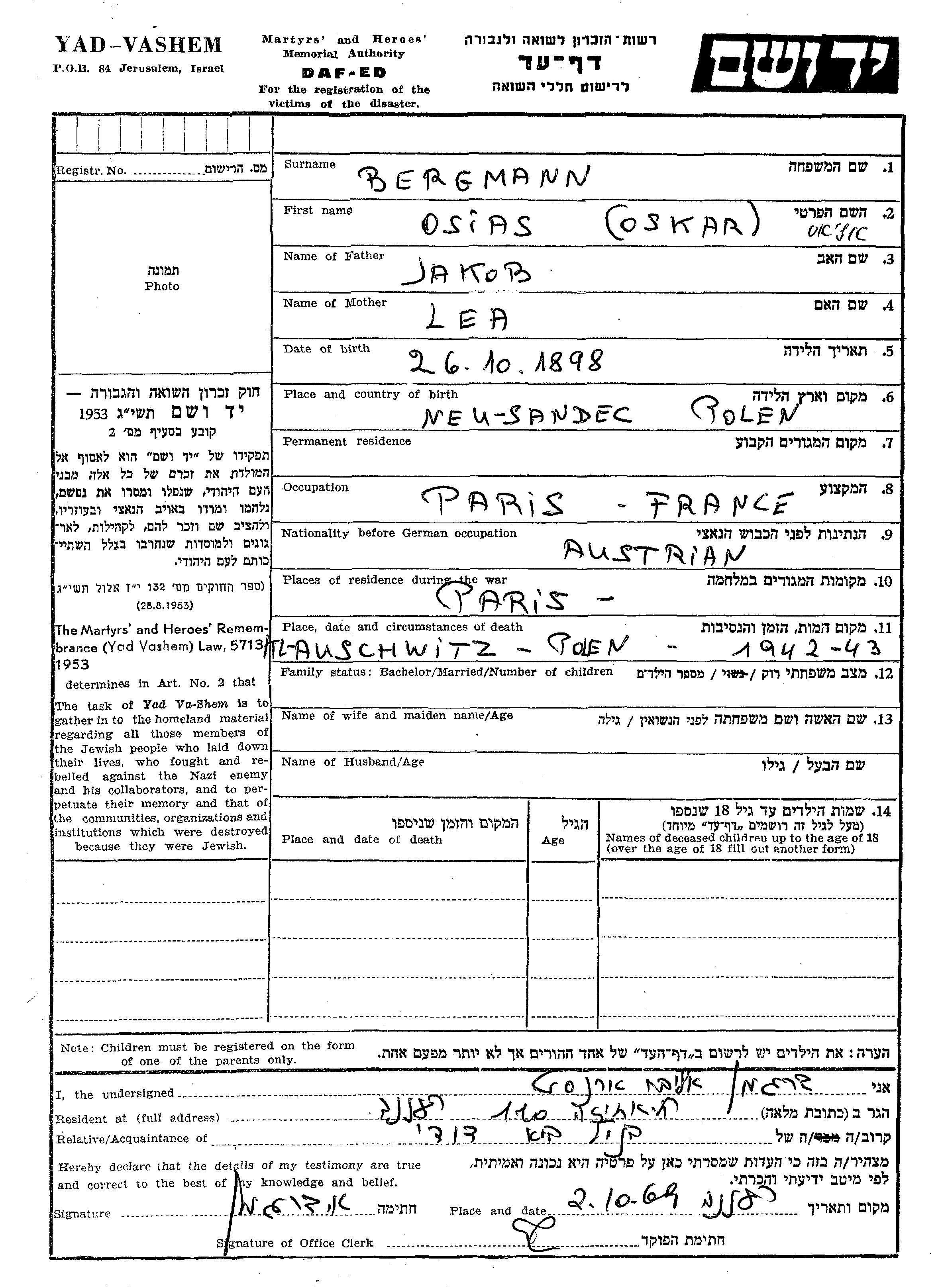 Osias Oskar Bergmann wurde im Jahr 1898 in Neu Sandez, Polen geboren. Er war der Sohn von Jakob und Lea. Vor dem Zweiten Weltkrieg lebte er in Paris, Frankreich. Während des Krieges war er in Paris, Frankreich.