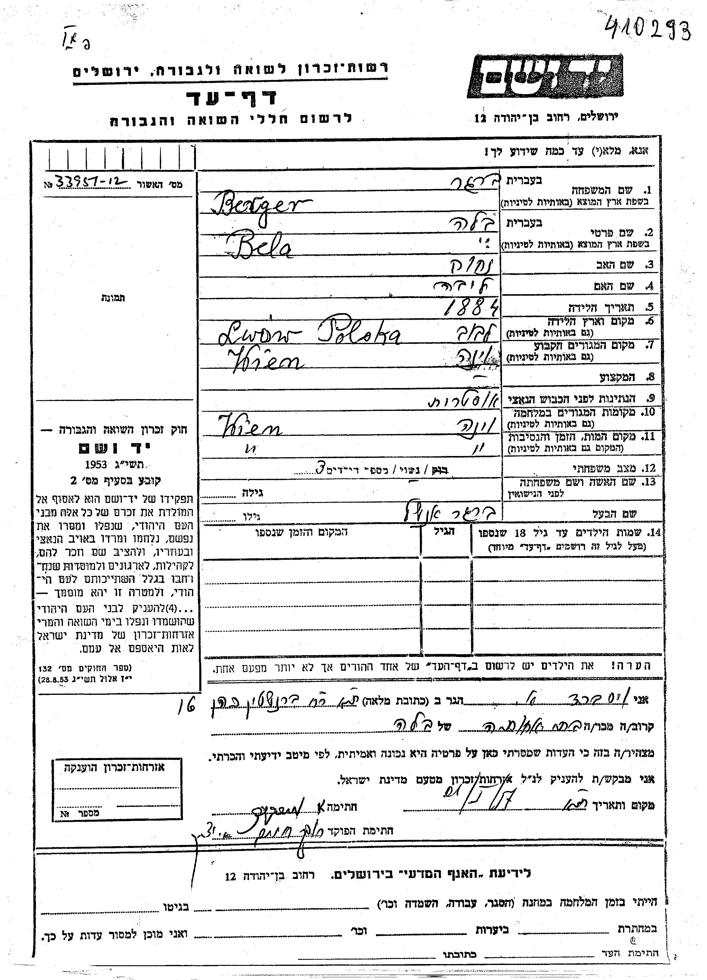 Bela Berger wurde im Jahr 1884 in Lwow, Polen geboren. Sie war die Tochter von Nakhum und Liba. Sie war mit Anshel Verheiratet. Vor dem Zweiten Weltkrieg lebte sie in Wien, Österreich. Während des Krieges war sie in Wien, Österreich.
