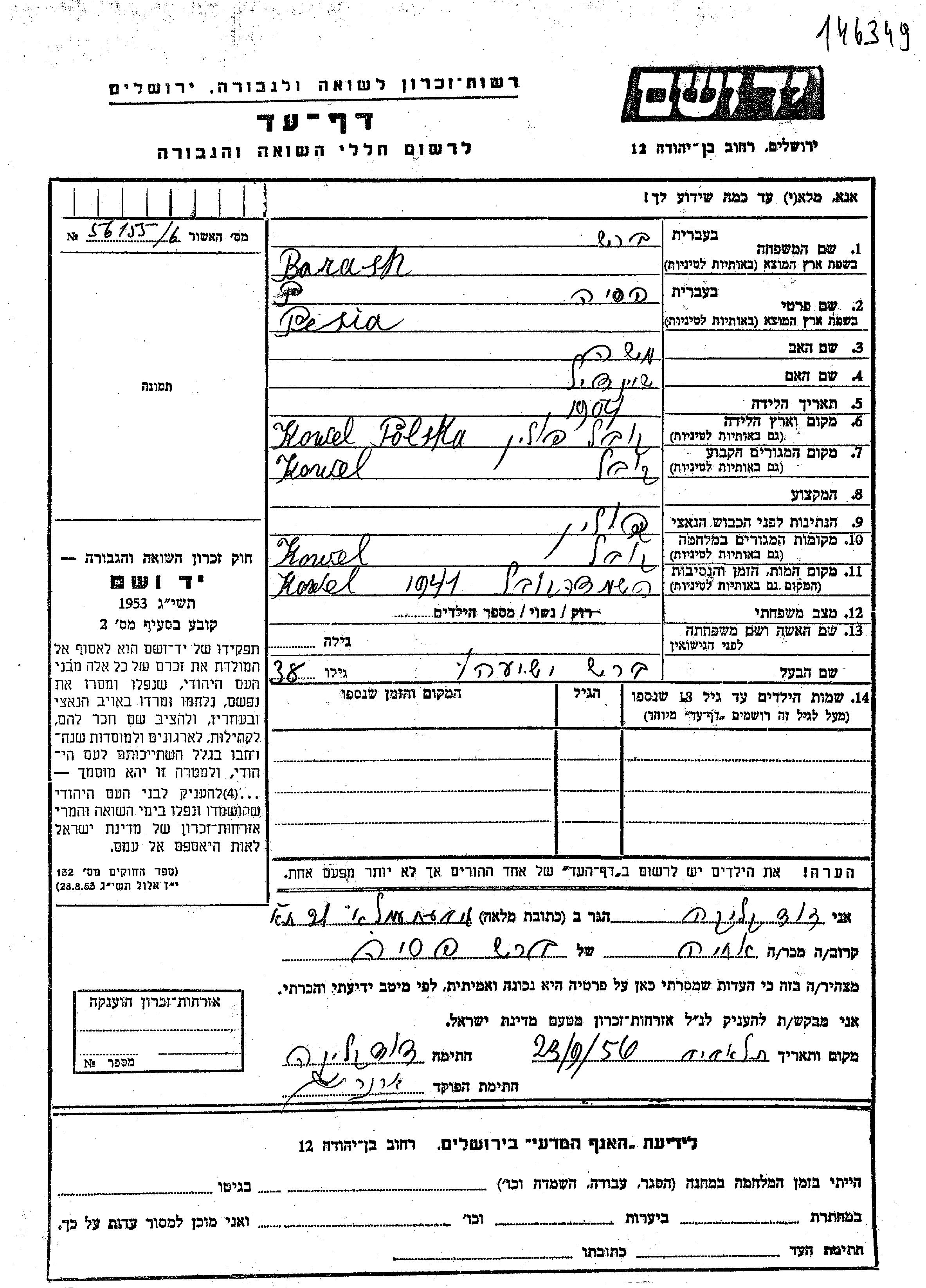 Pesia Barash wurde im Jahr 1904 in Kowel, Polen geboren. Sie war die Tochter von Moshe und Sheindil. Sie war mit Ishiyahu Verheiratet. Vor dem Zweiten Weltkrieg lebte sie in Kowel, Polen. Während des Krieges war sie in Kowel, Polen.