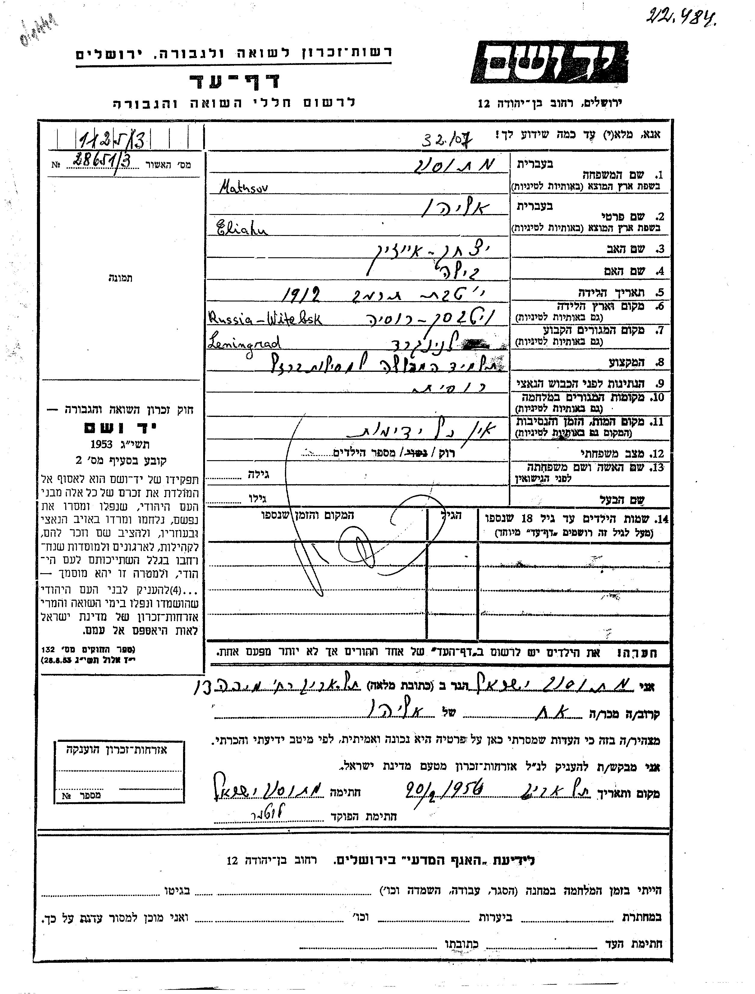 Eliahu Matusov wurde im Jahr 1912 in Vitebsk, Weißrussland (UdSSR) geboren. Er war der Sohn von Yitzkhak und Bila. Er war Schüler/-in und Ledig. Vor dem Zweiten Weltkrieg lebte er in Leningrad, Russland (UdSSR).