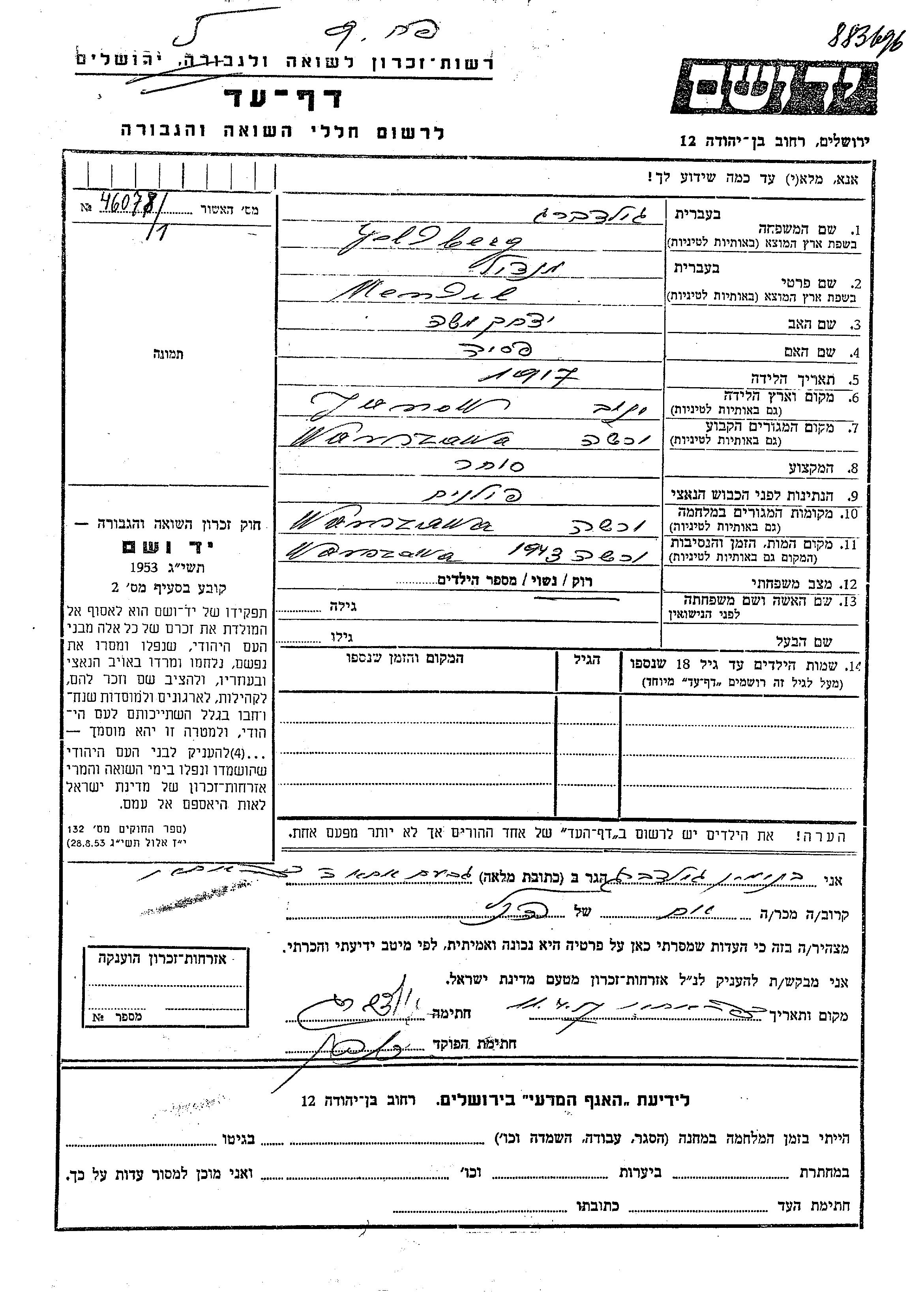 Mendil Goldberg wurde im Jahr 1917 in Janow, Polen geboren. Er war der Sohn von Yitzkhak Moshe und Pesia. Er war Kaufmann/-frau. Vor dem Zweiten Weltkrieg lebte er in Warszawa, Polen. Während des Krieges war er in Warszawa, Polen.
