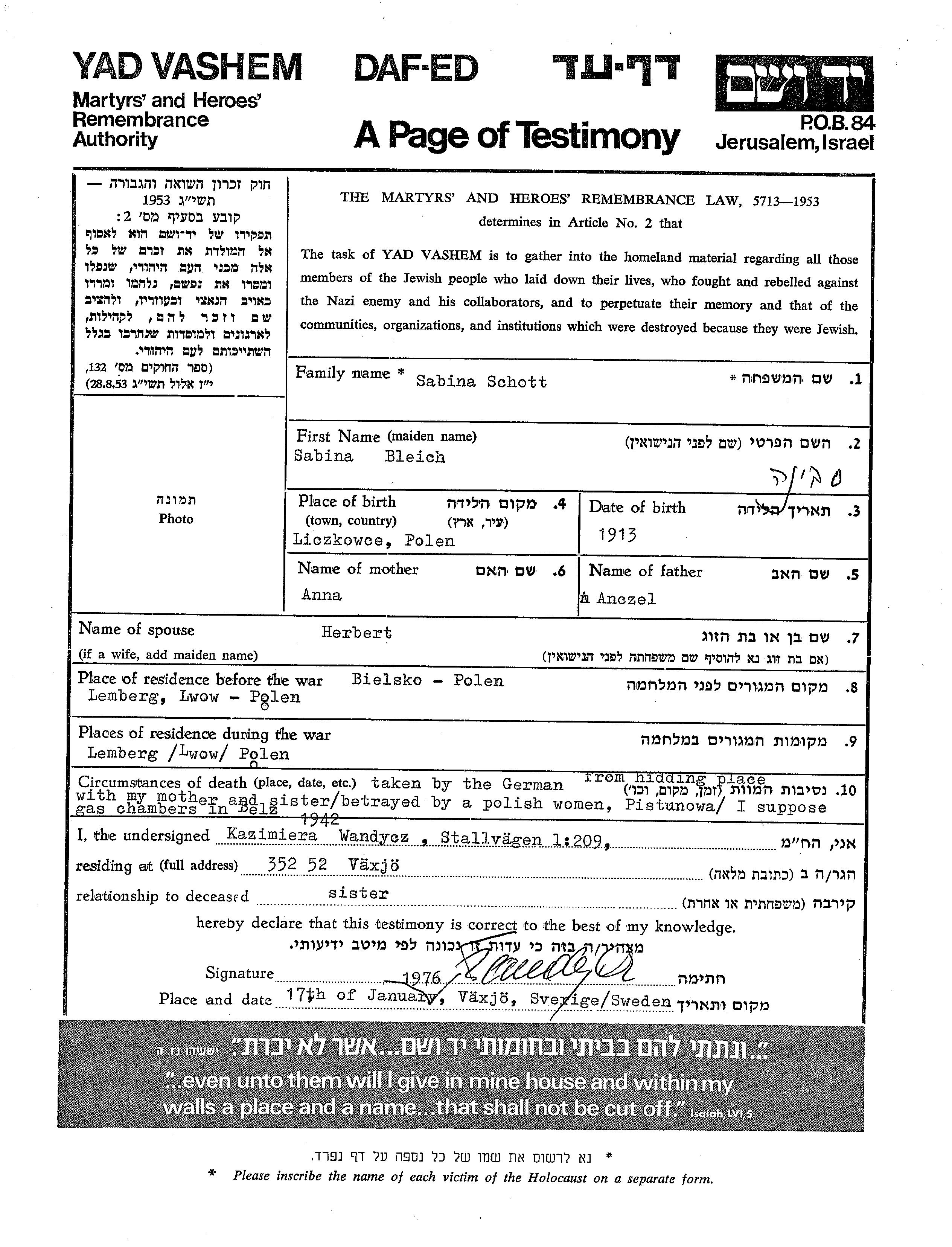 Sabina Schott, geb. Bleich wurde im Jahr 1913 in Liczkowce, Polen geboren. Sie war die Tochter von Anczel und Anna. Sie war mit Herbert Verheiratet. Vor dem Zweiten Weltkrieg lebte sie in Lwow, Polen. Während des Krieges war sie in Lwow, Polen.