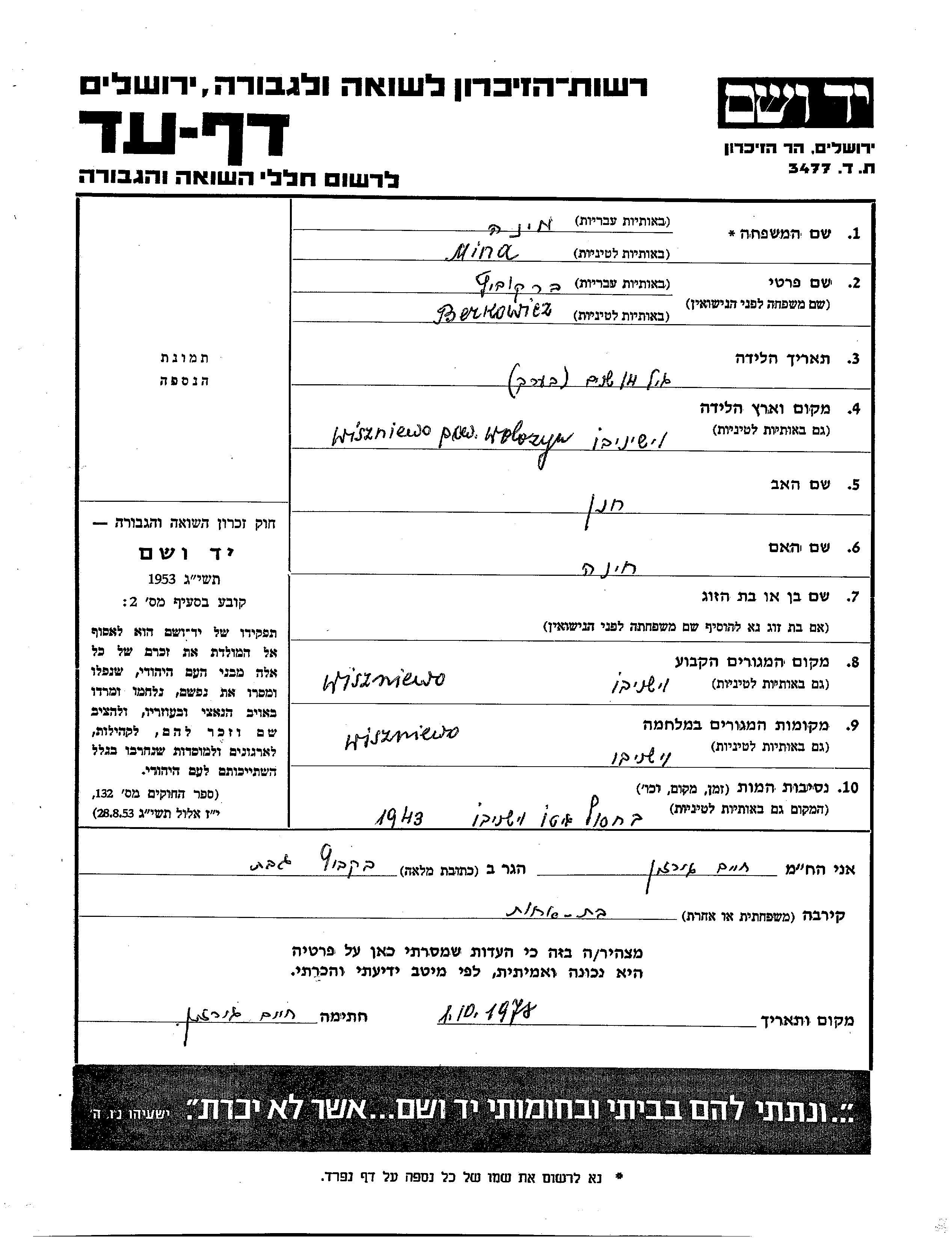 Mina Berkowicz wurde in Wisznievo, Polen geboren. Sie war die Tochter von Khanan und Khina. Sie war Ledig. Vor dem Zweiten Weltkrieg lebte sie in Wisznievo, Polen. Während des Krieges war sie in Wisznievo, Polen.