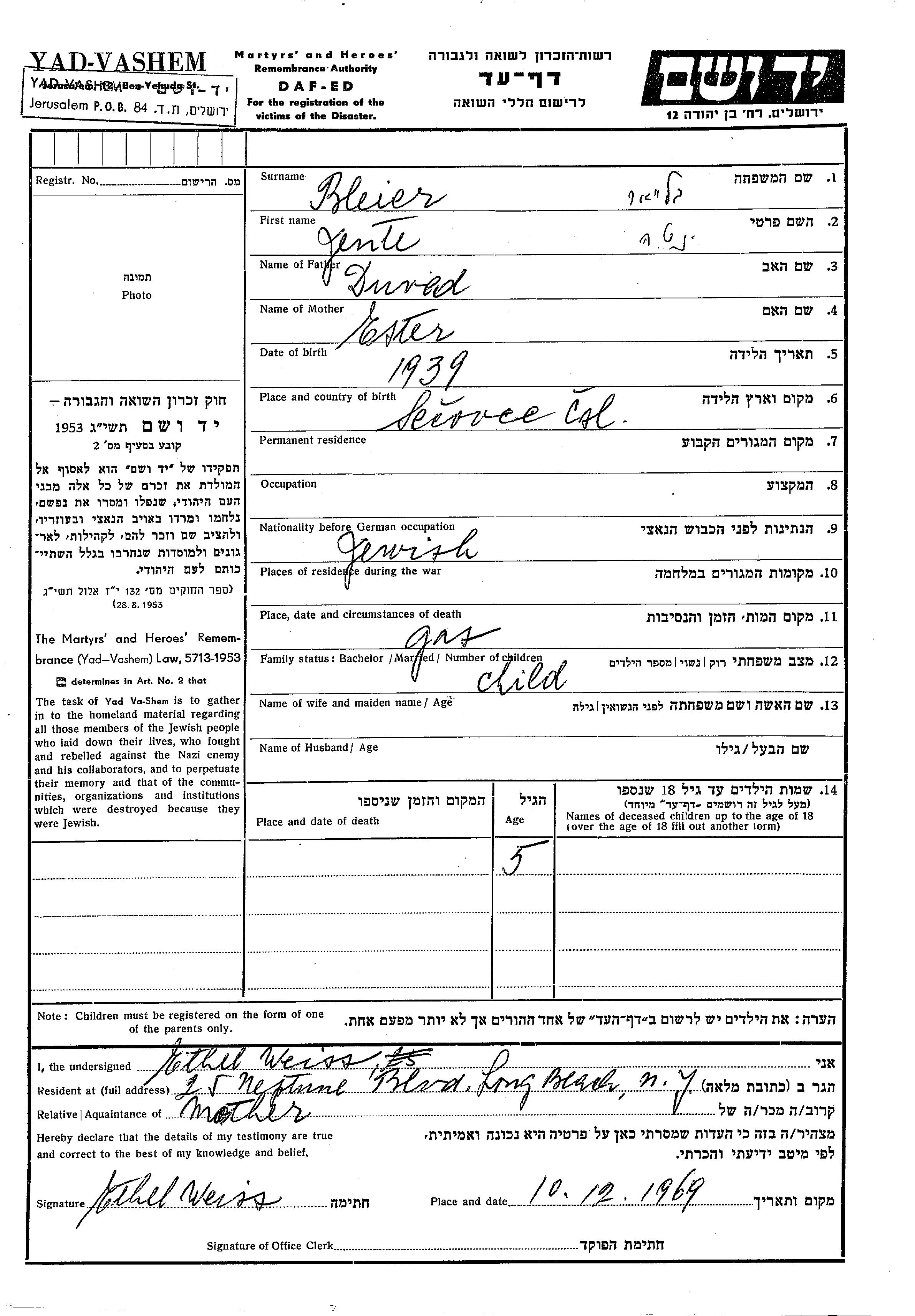 Yente Bleier wurde im Jahr 1939 in Secovce, Tschechoslowakei geboren. Sie war die Tochter von Duved und Ester. Sie war Ledig.