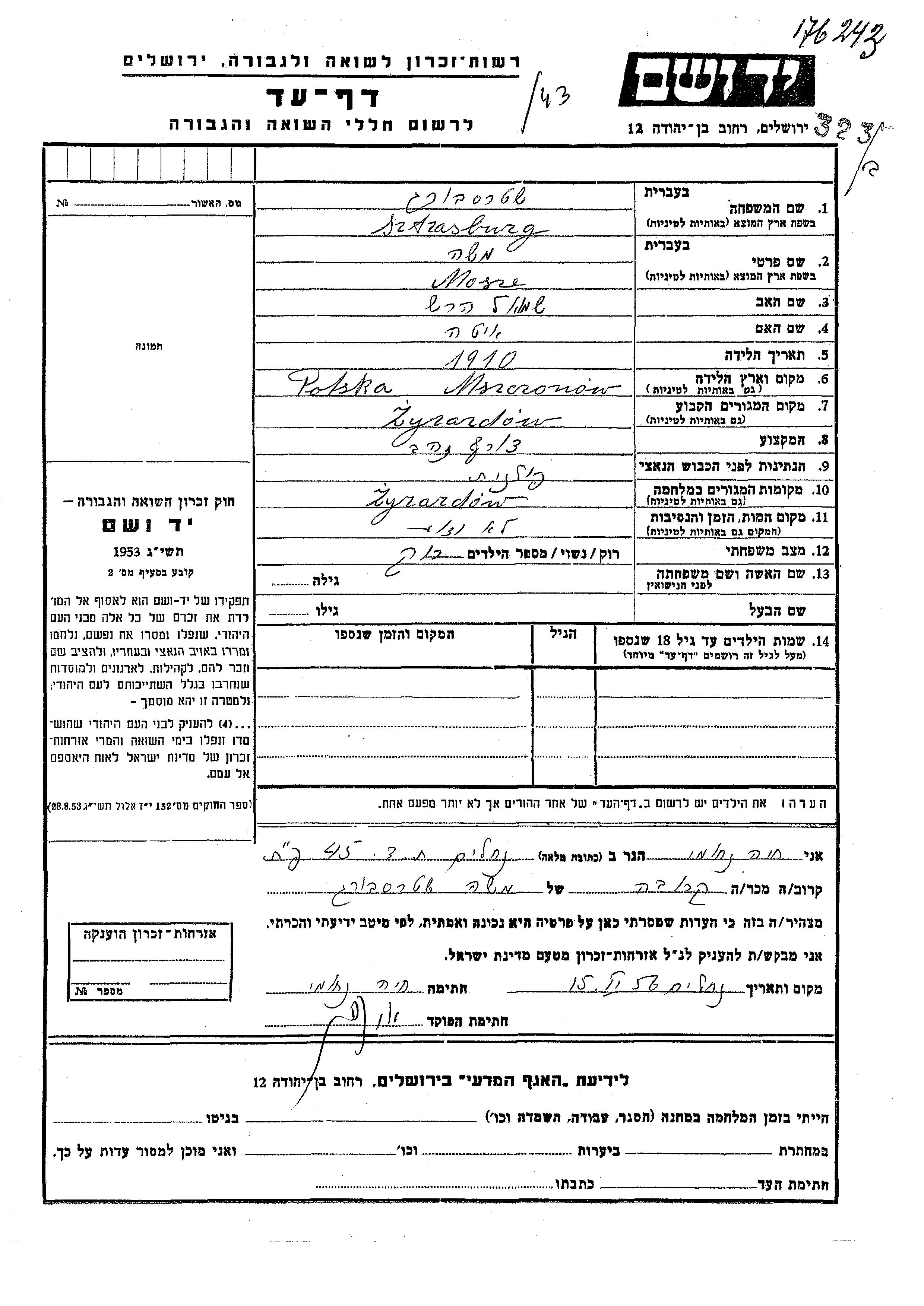 Mosze Sztrasburg wurde im Jahr 1910 in Mszczonow, Polen geboren. Er war der Sohn von Shmuel Hersh und Ita. Er war Goldschmied/-in und Ledig. Vor dem Zweiten Weltkrieg lebte er in Zyrardow, Polen. Während des Krieges war er in Zyrardow, Polen.