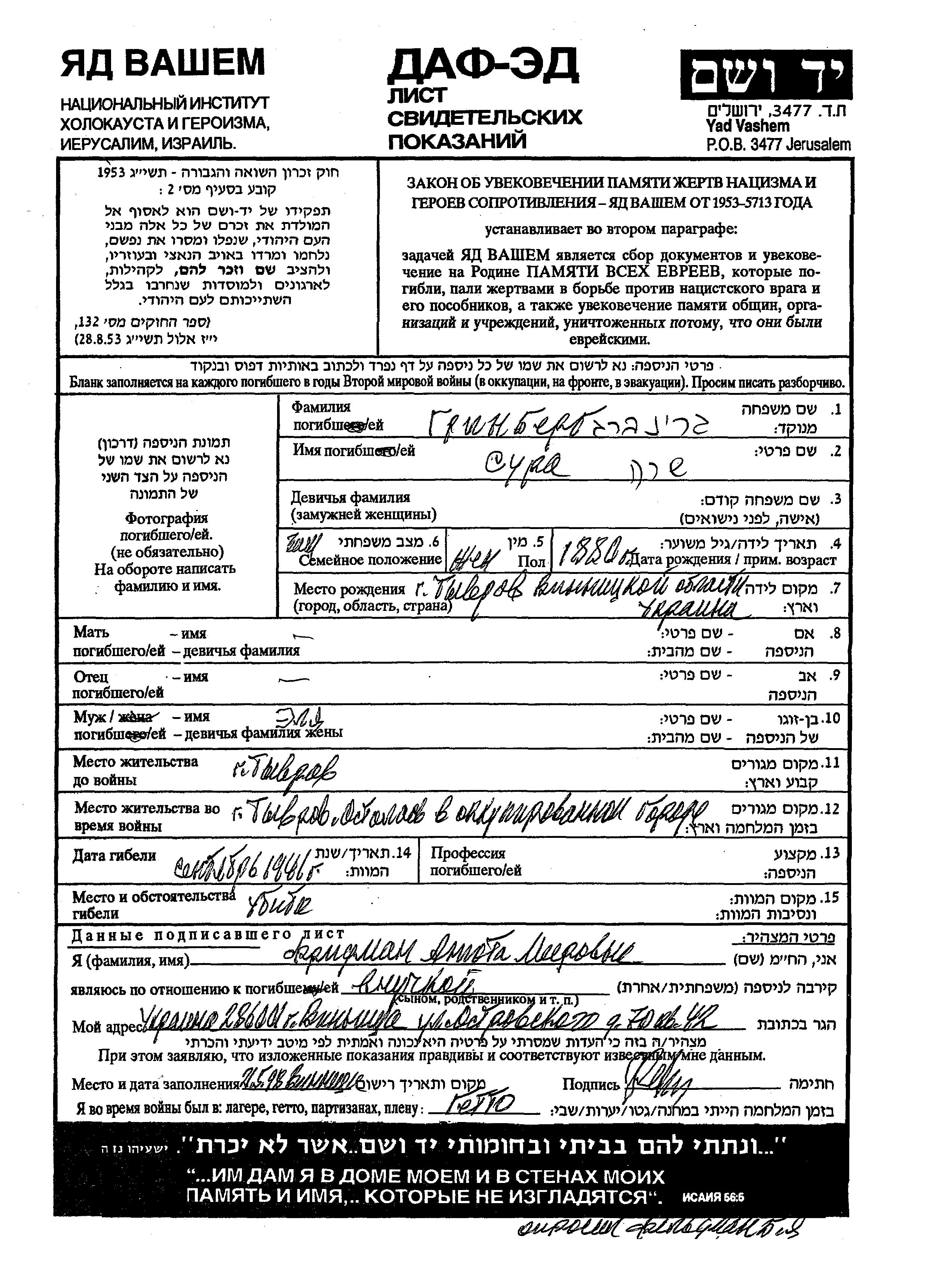 Sura wurde in der Schoah ermordet. Todesort: Tyvrov, Ukraine (UdSSR) im Jahr 09/1941.