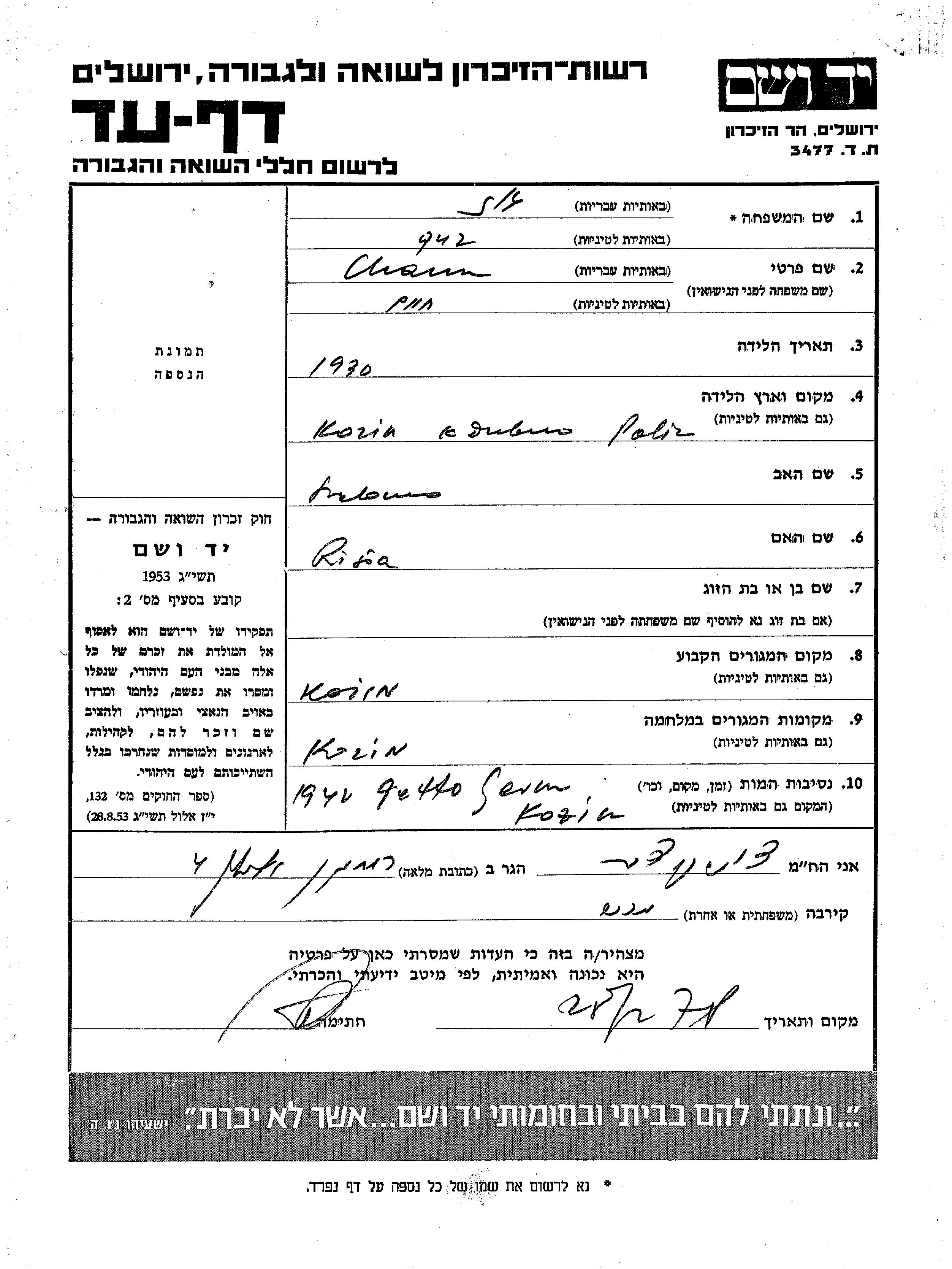 Chaim wurde in der Schoah ermordet. Todesort: Kozin, Polen im Jahr 1942.