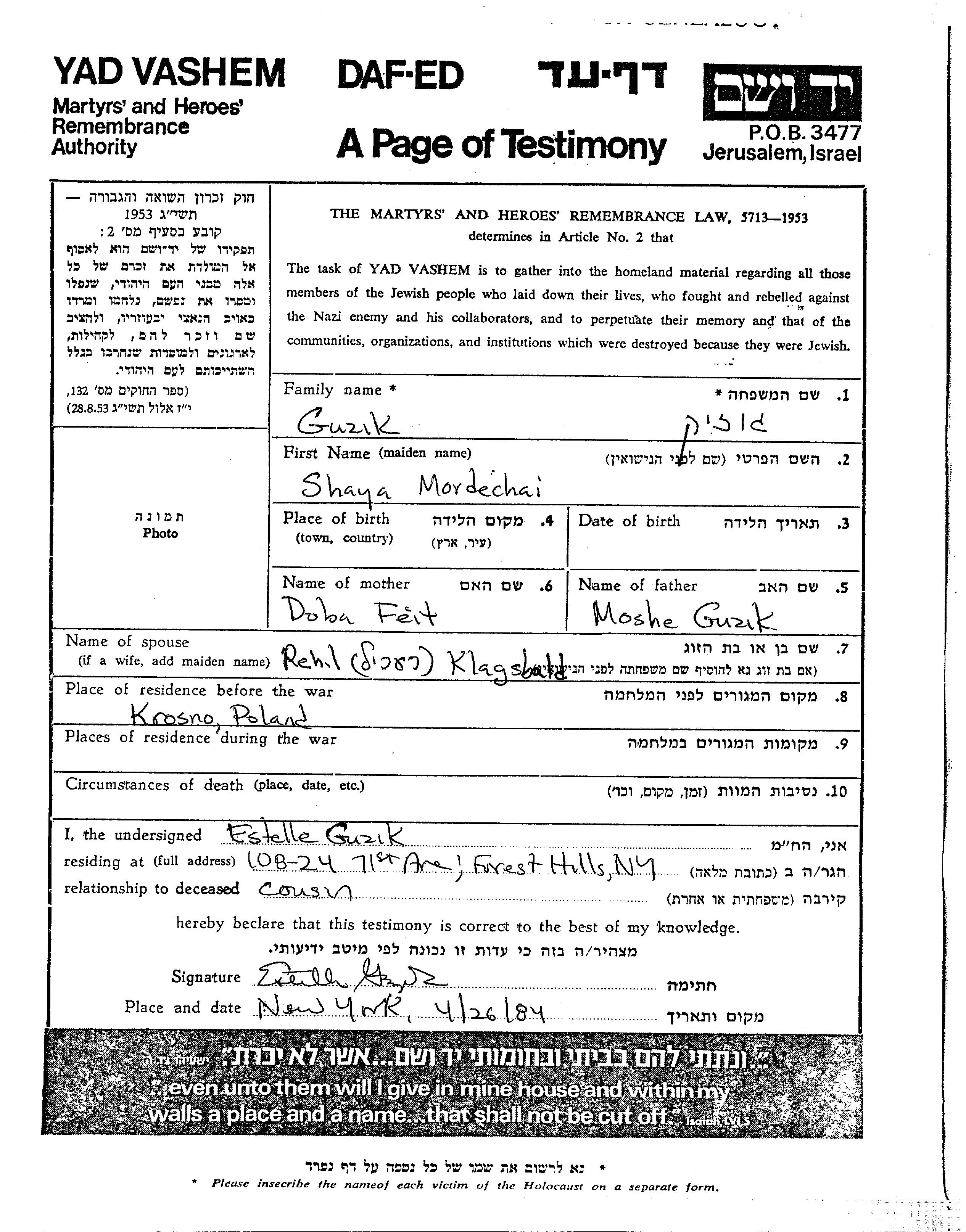 Shaya Mordechai Guzik wurde Er war der Sohn von Moshe und Doba. Er war mit Rehil, geb. Klagsbald Verheiratet. Vor dem Zweiten Weltkrieg lebte er in Krosno, Polen.