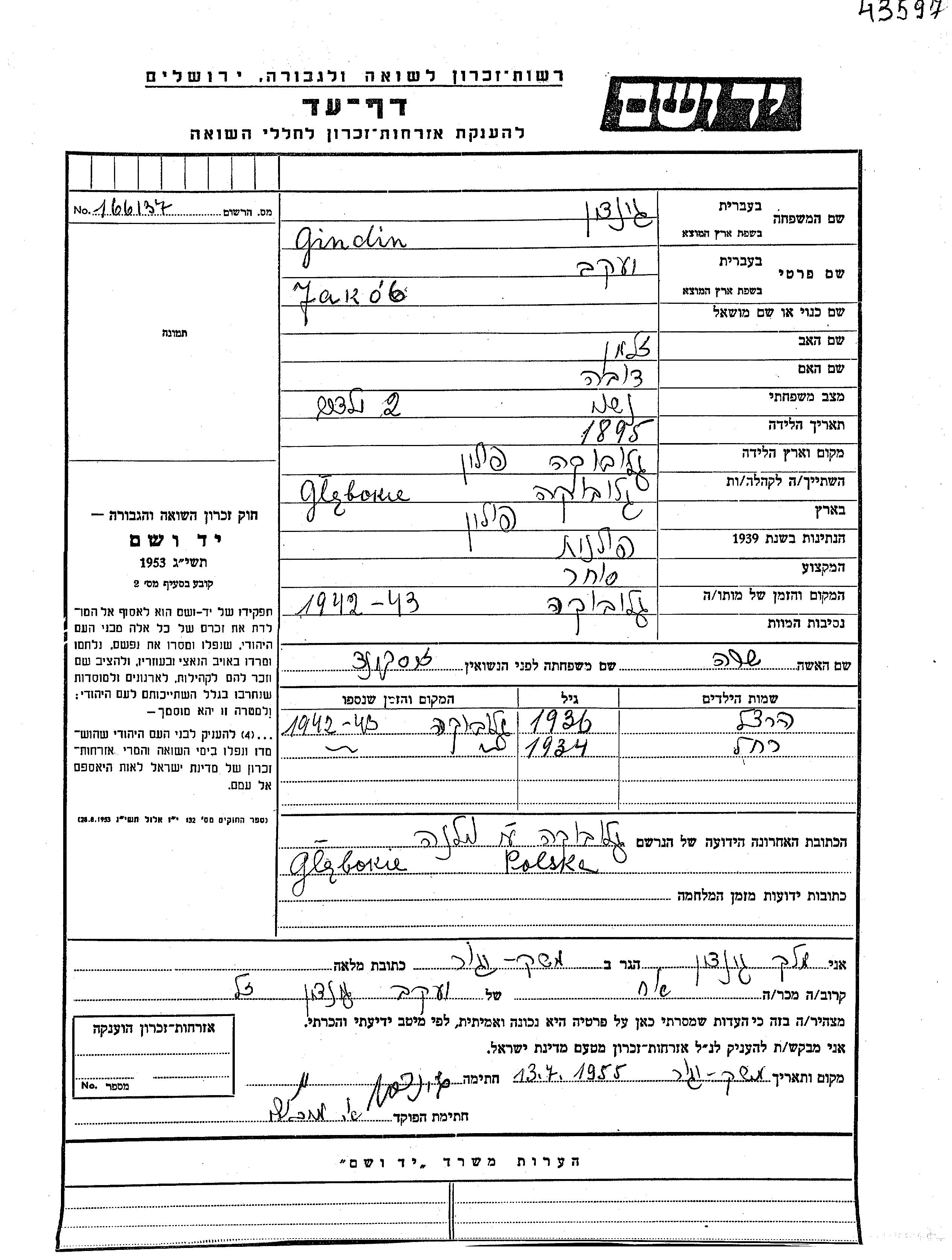 Yakob Gindin wurde im Jahr 1895 in Gleboka, Polen geboren. Er war der Sohn von Zalman und Doba. Er war Kaufmann/-frau und mit Sara, geb. Zuskind Verheiratet. Vor dem Zweiten Weltkrieg lebte er in Gleboka, Polen. Während des Krieges war er in Gleboka, Polen.