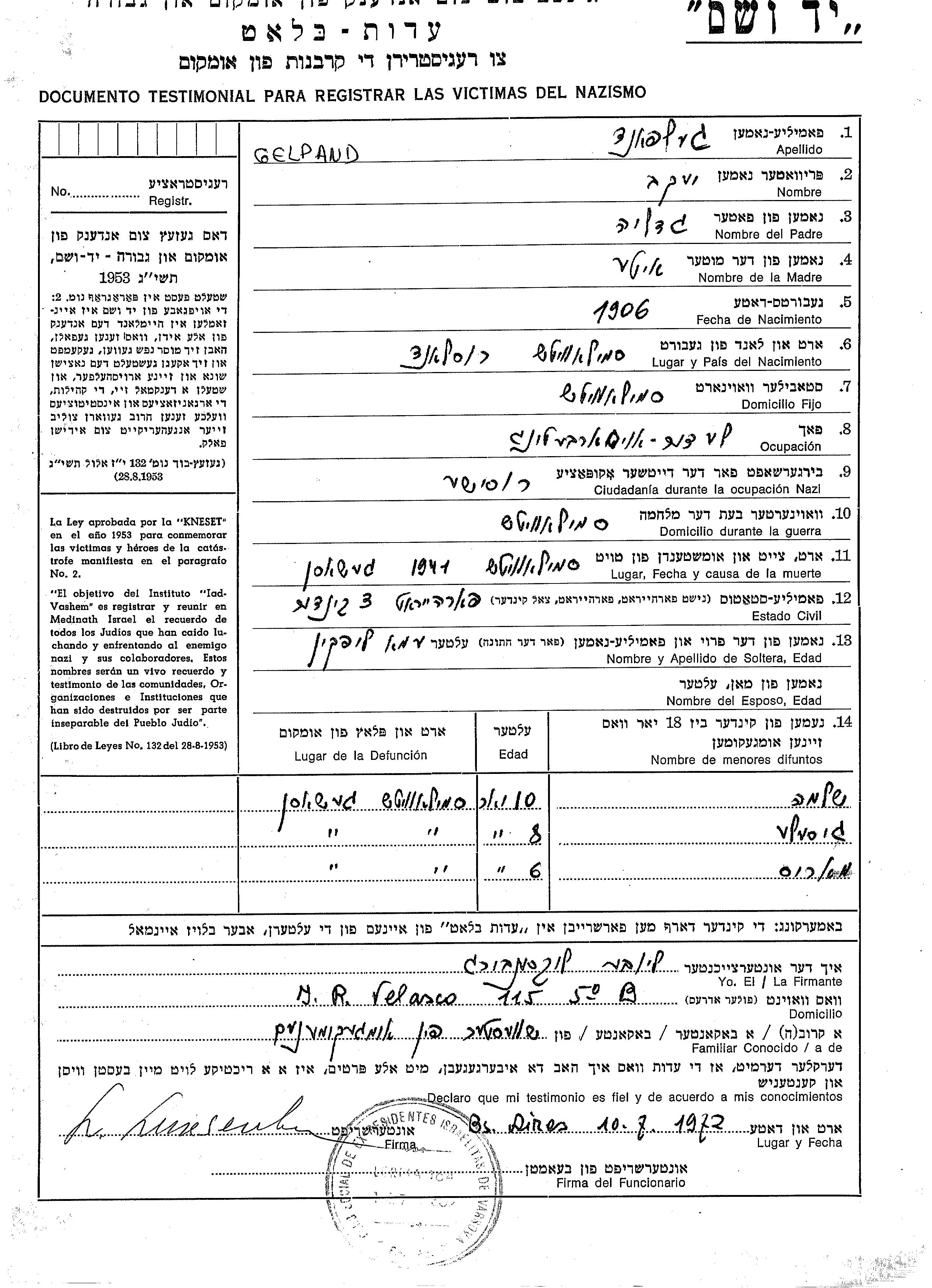 Yaakov Gelpand wurde im Jahr 1906 in Smilovichi, Weißrussland (UdSSR) geboren. Er war der Sohn von Gedalia und Ite. Er war לעדער-סוחר und mit Ema, geb. Lipkin Verheiratet. Vor dem Zweiten Weltkrieg lebte er in Smilovichi, Weißrussland (UdSSR). Während des Krieges war er in Smilovichi, Weißrussland (UdSSR).