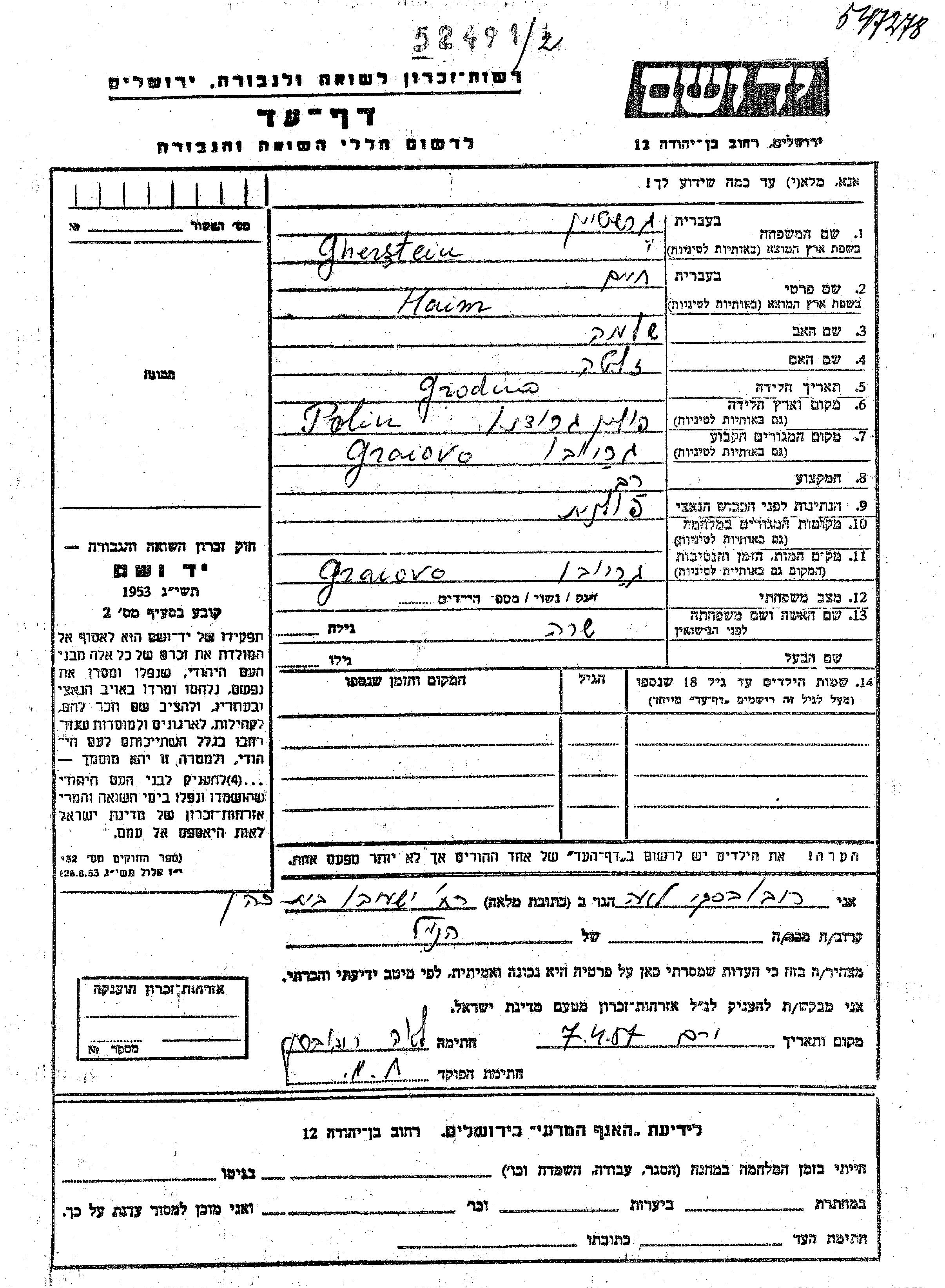 Haim Ghersztein wurde in Grodno, Polen geboren. Er war der Sohn von Shlomo und Zlata. Er war Rabbiner und mit Sara Verheiratet. Vor dem Zweiten Weltkrieg lebte er in Grajevo, Polen. Während des Krieges war er in Grajevo, Polen.