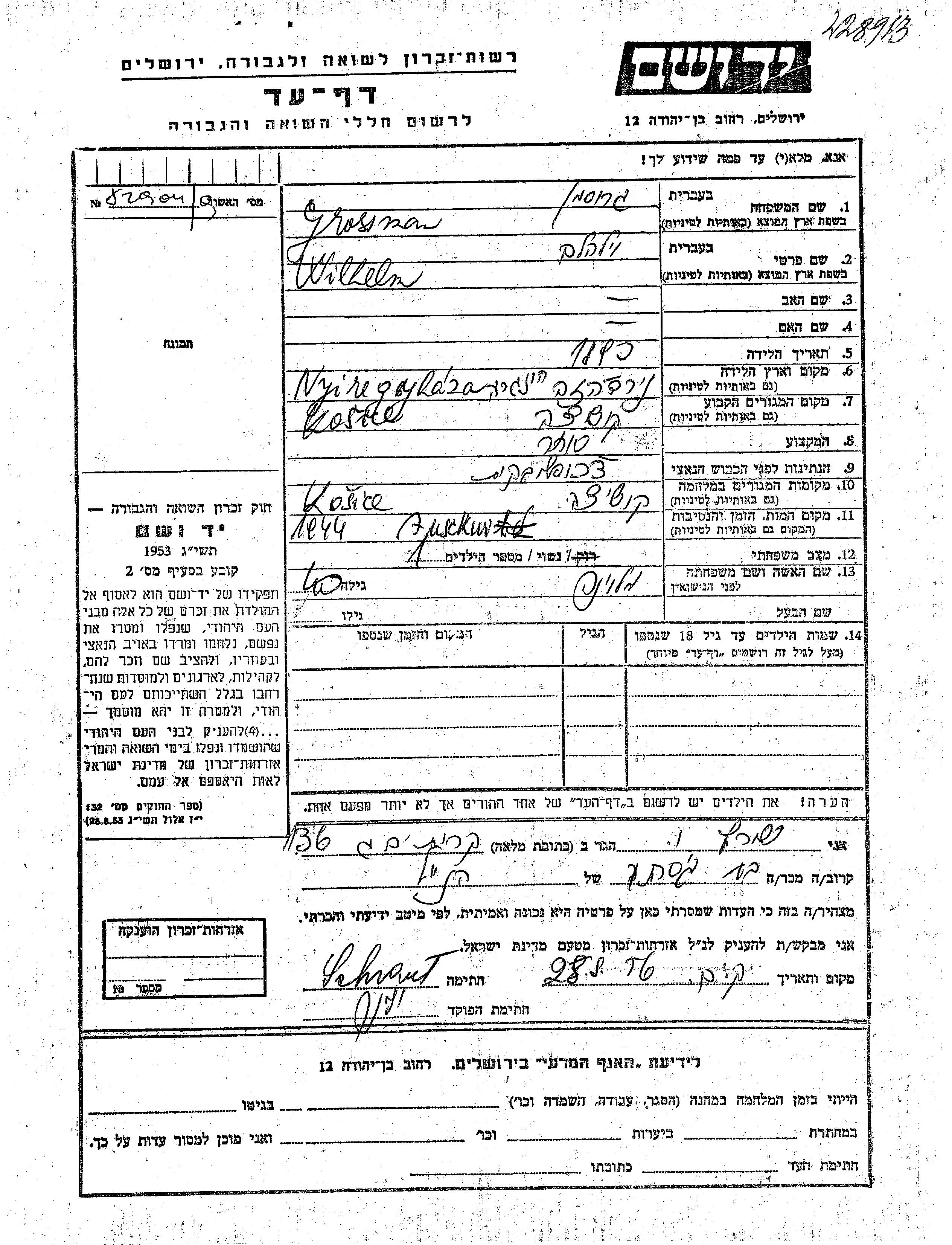 Wilhelm Grosman wurde im Jahr 1890 in Nyiregyhaza, Ungarn geboren. Er war Kaufmann/-frau und mit Malvina Verheiratet. Vor dem Zweiten Weltkrieg lebte er in Kosice, Tschechoslowakei. Während des Krieges war er in Kosice, Tschechoslowakei.