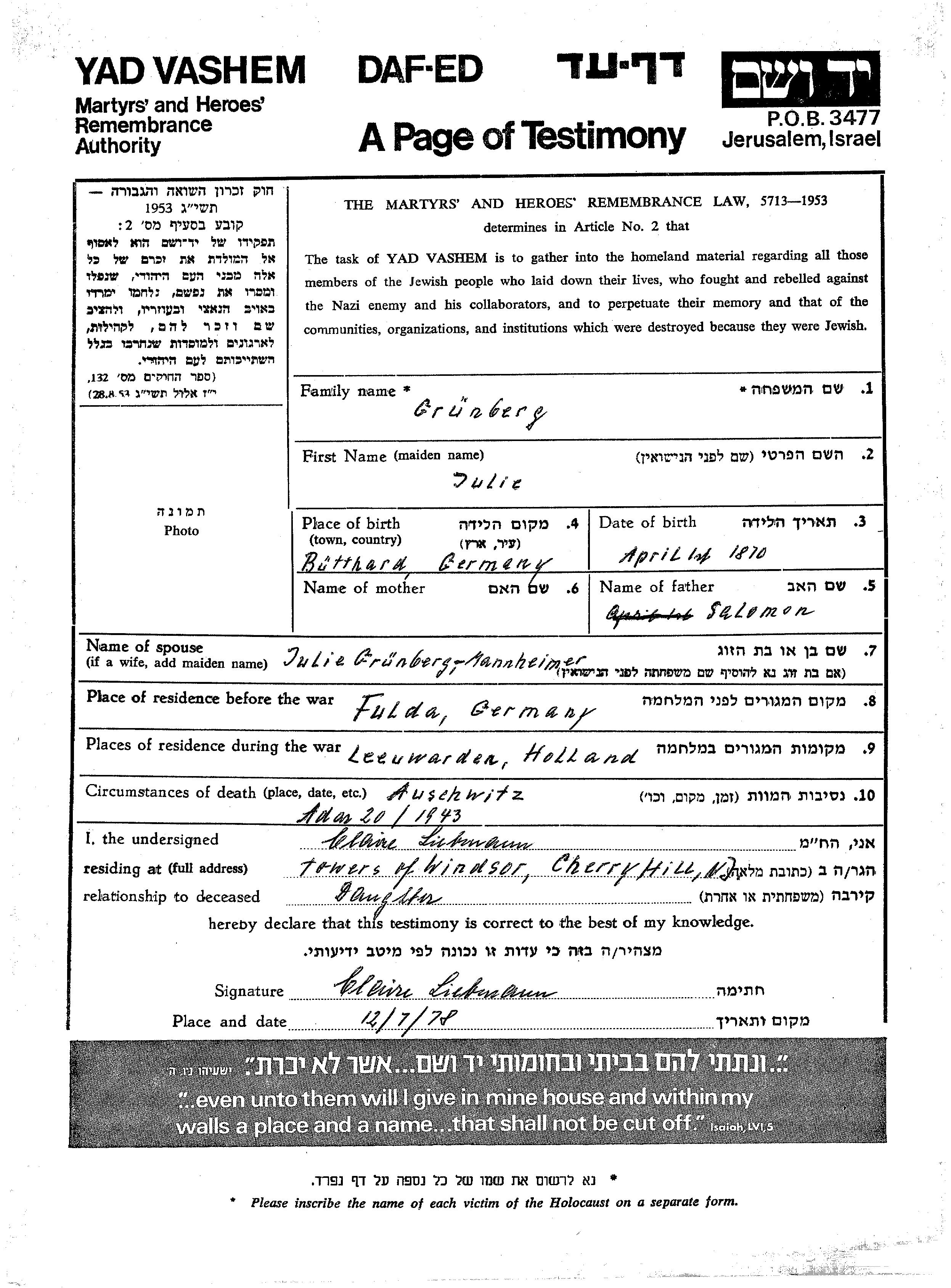 Julie Grünberg, geb. Mannheimer wurde im Jahr 1870 in Buetthard, Deutsches Reich geboren. Sie war die Tochter von Salomon. Sie war Verheiratet. Vor dem Zweiten Weltkrieg lebte sie in Fulda, Deutsches Reich. Während des Krieges war sie in Leeuwarden, Niederlande.