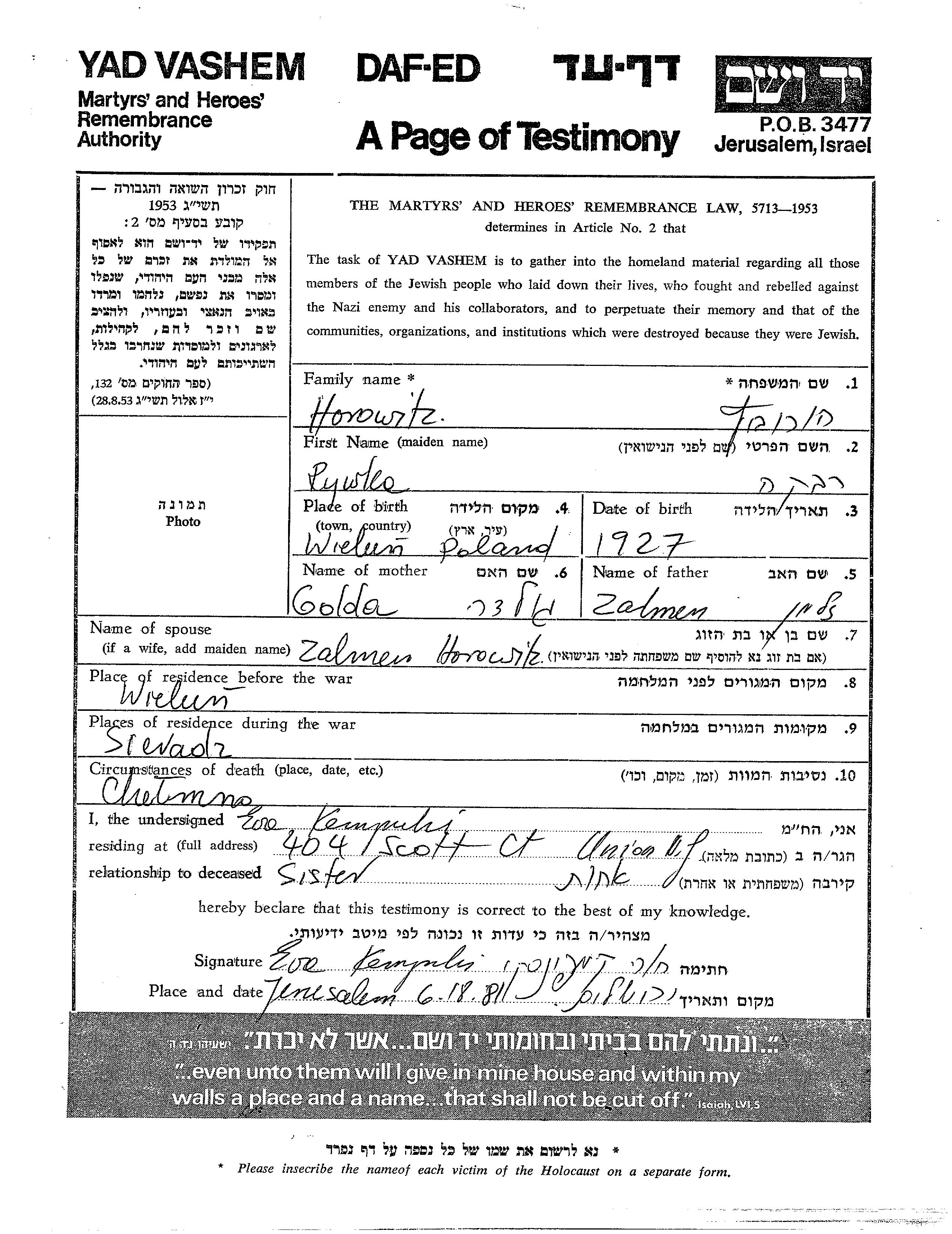 Rywke Horowitz wurde im Jahr 1927 in Wielun, Polen geboren. Sie war die Tochter von Zalmen und Golda. Sie war mit Zalman Verheiratet. Vor dem Zweiten Weltkrieg lebte sie in Wielun, Polen. Während des Krieges war sie in Sieradz, Polen.