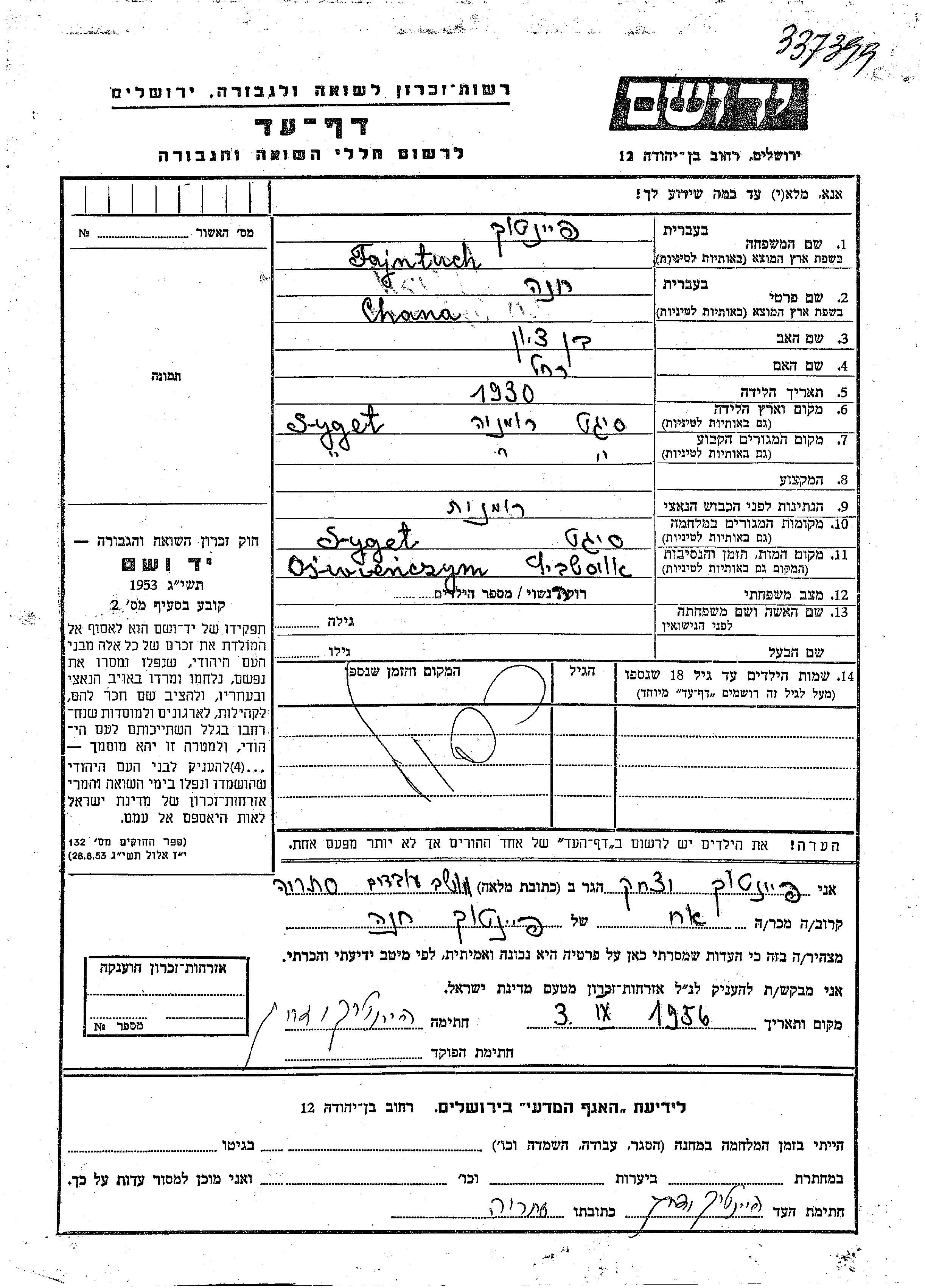 Chana Fajntuch wurde im Jahr 1930 in Syget, Rumänien geboren. Sie war die Tochter von Bentzion und Rakhel. Sie war Ledig. Vor dem Zweiten Weltkrieg lebte sie in Syget, Rumänien. Während des Krieges war sie in Syget, Rumänien.