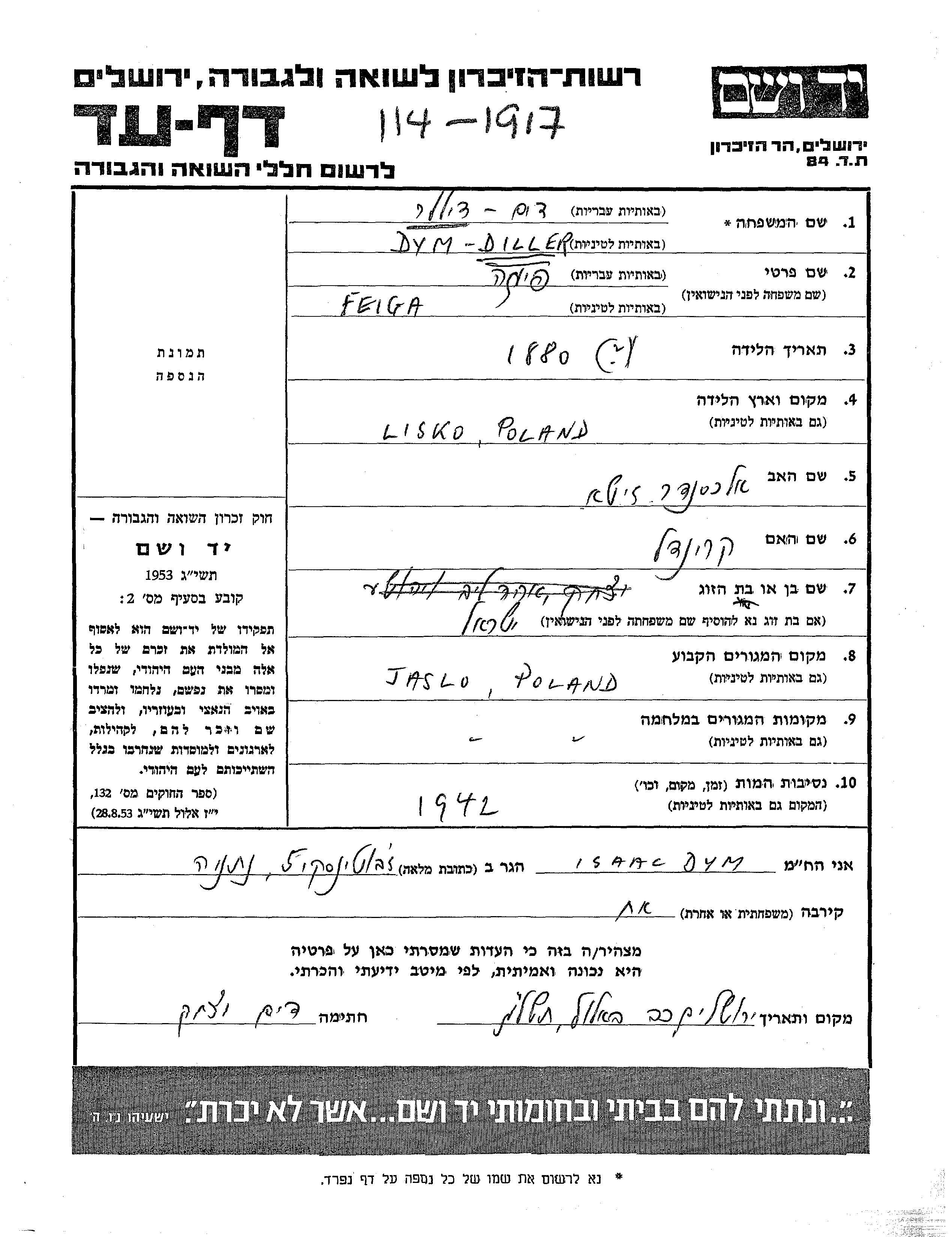 Feiga Diller, geb. Dym Dum wurde im Jahr 1880 in Lisko, Polen geboren. Sie war die Tochter von Aleksander Zisha und Kreina. Sie war mit Yisrael Verheiratet. Vor dem Zweiten Weltkrieg lebte sie in Jaslo, Polen. Während des Krieges war sie in Jaslo, Polen.