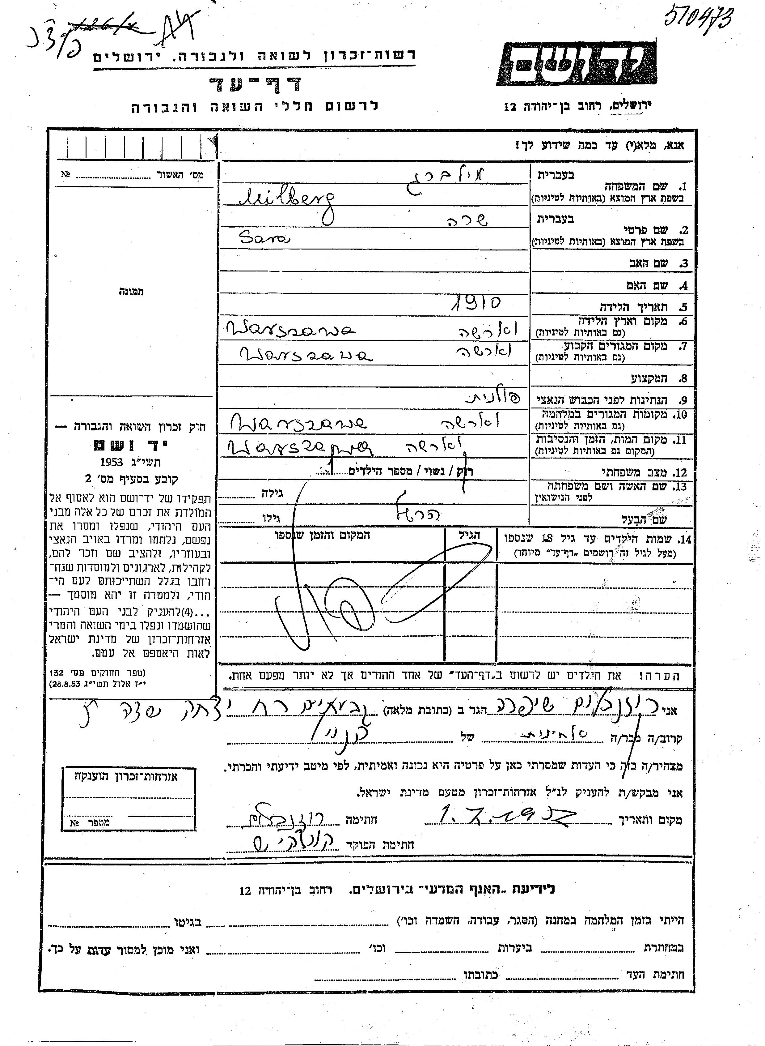 Sara Milberg wurde im Jahr 1910 in Warszawa, Polen geboren. Sie war mit Hershel Verheiratet. Vor dem Zweiten Weltkrieg lebte sie in Warszawa, Polen. Während des Krieges war sie in Warszawa, Polen.