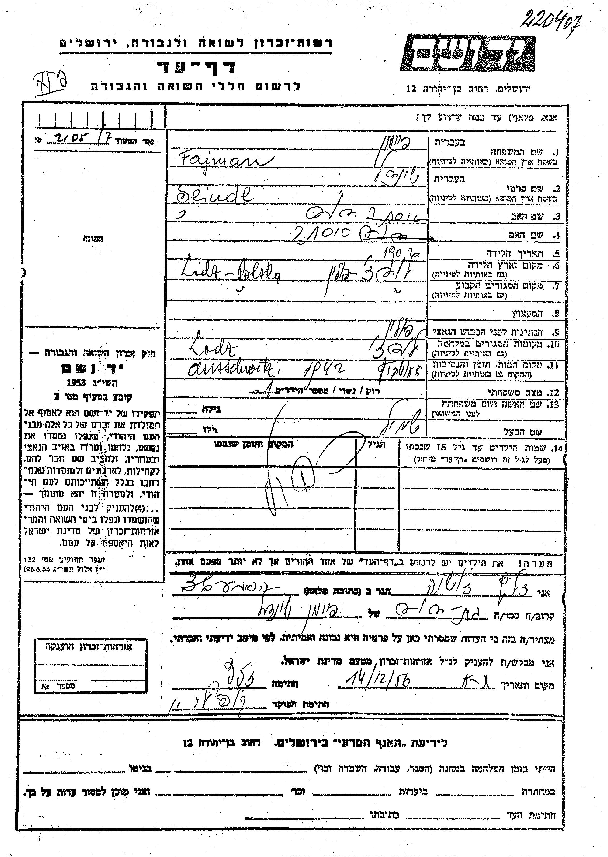 Seindel Fajman wurde im Jahr 1902 in Lodz, Polen geboren. Sie war die Tochter von David und Ester. Sie war mit Shmil Verheiratet. Vor dem Zweiten Weltkrieg lebte sie in Lodz, Polen. Während des Krieges war sie in Lodz, Polen.