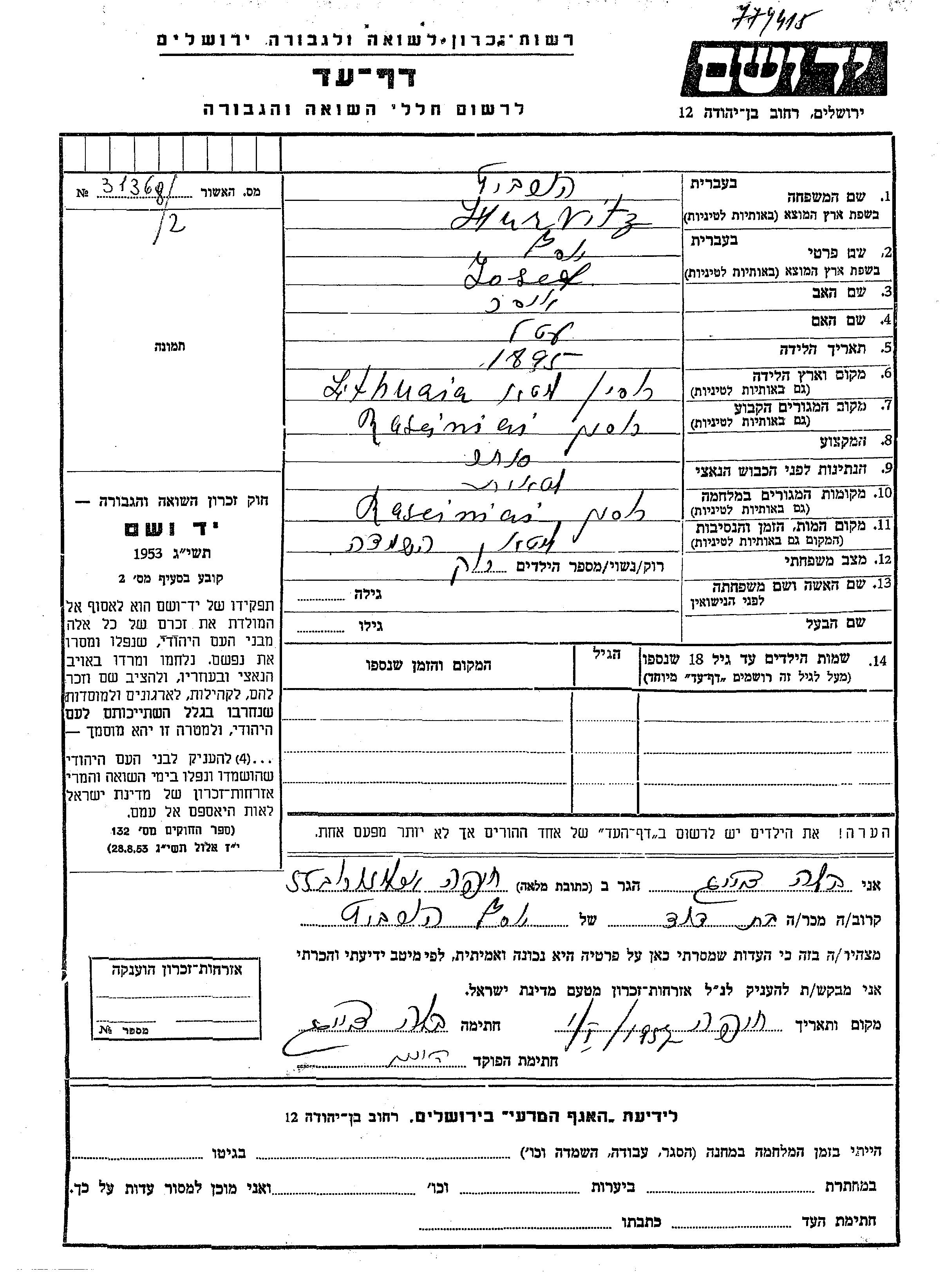 Josef Hurvitz wurde im Jahr 1895 in Raseiniai, Litauen geboren. Er war der Sohn von Asher Isser und Etel. Er war Kaufmann/-frau und Ledig. Vor dem Zweiten Weltkrieg lebte er in Raseiniai, Litauen. Während des Krieges war er in Raseiniai, Litauen.