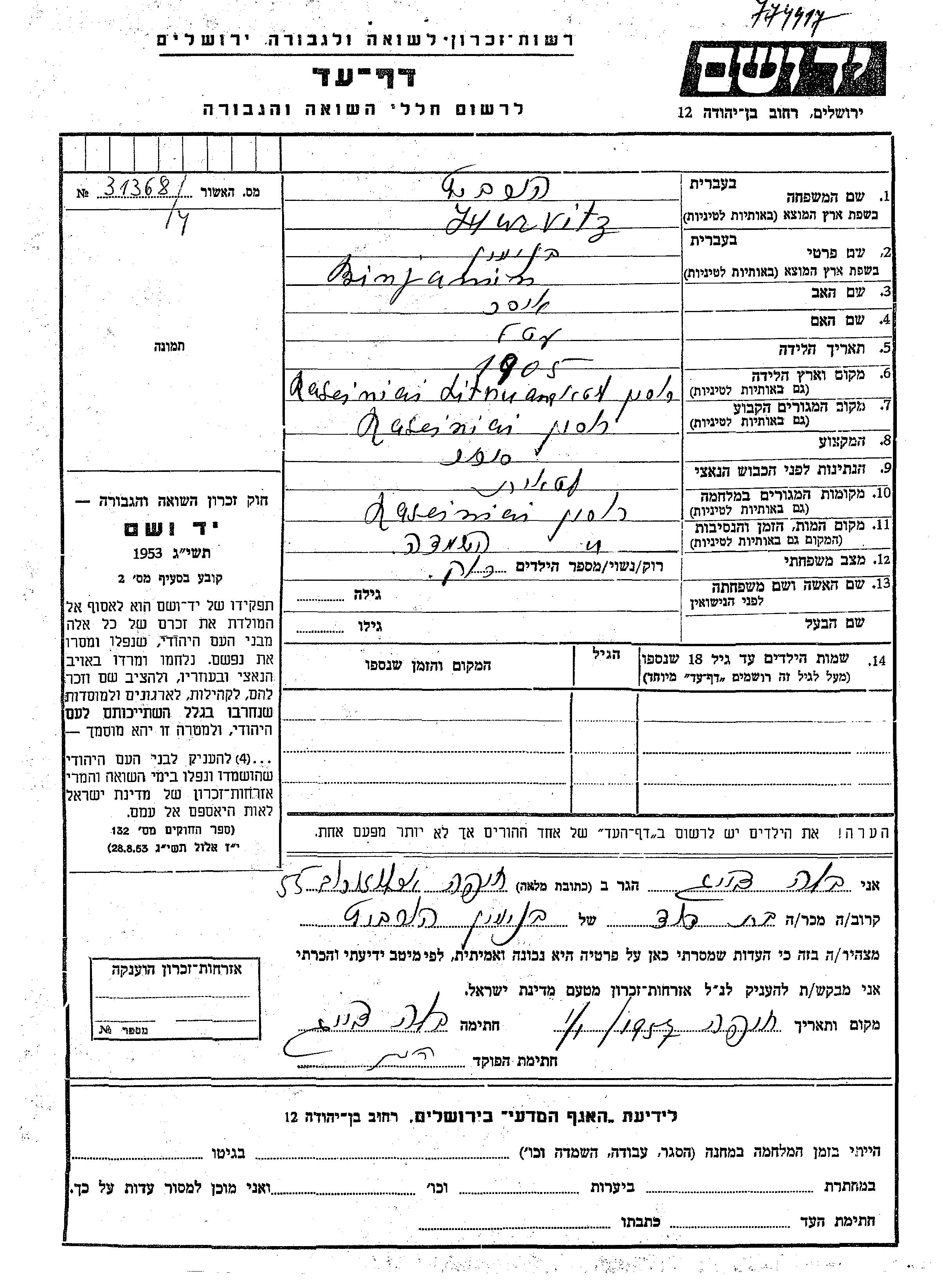 Binjamin wurde in der Schoah ermordet. Todesort: Raseiniai, Litauen.