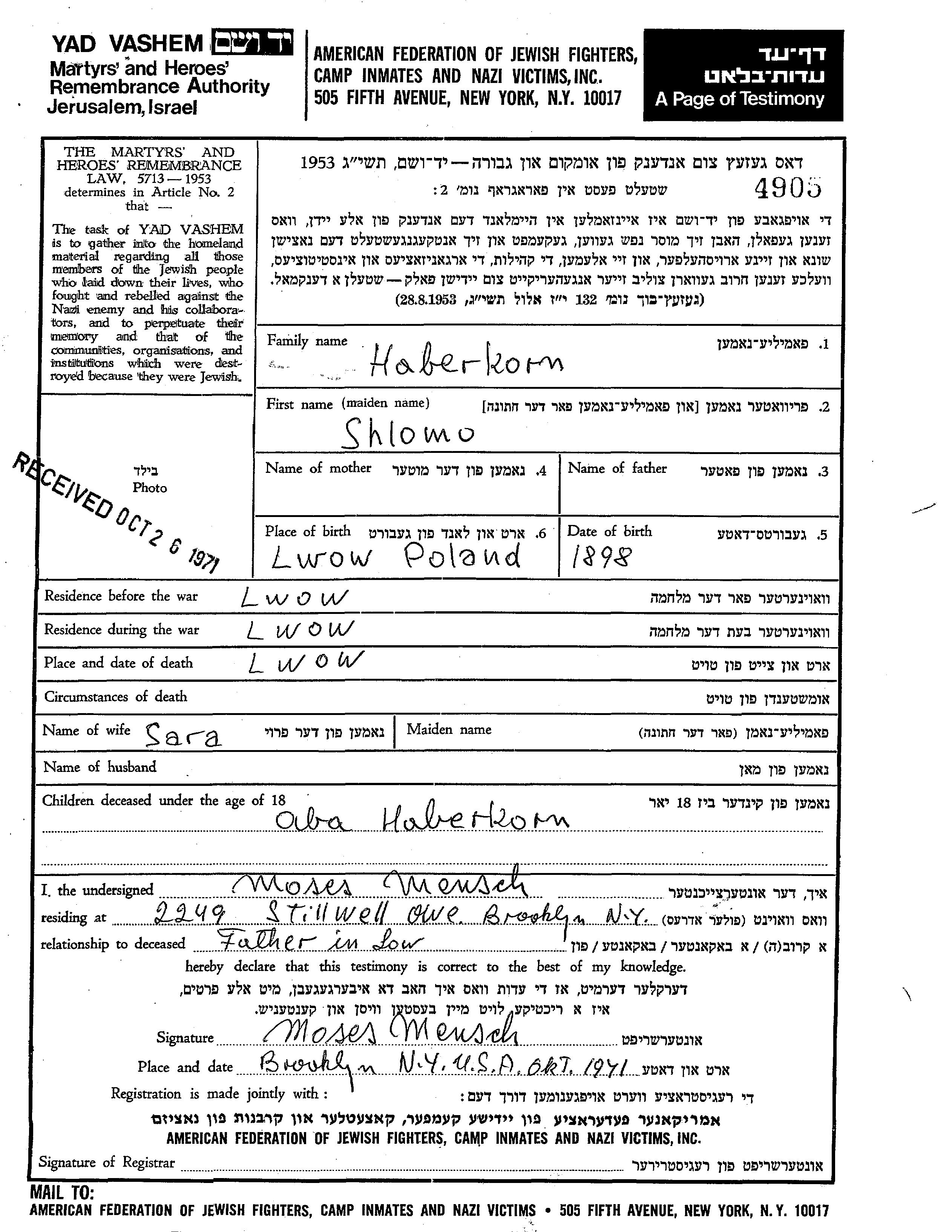 Shlomo Haberkorn wurde im Jahr 1898 in Lwow, Polen geboren. Vor dem Zweiten Weltkrieg lebte er in Lwow, Polen. Während des Krieges war er in Lwow, Polen.