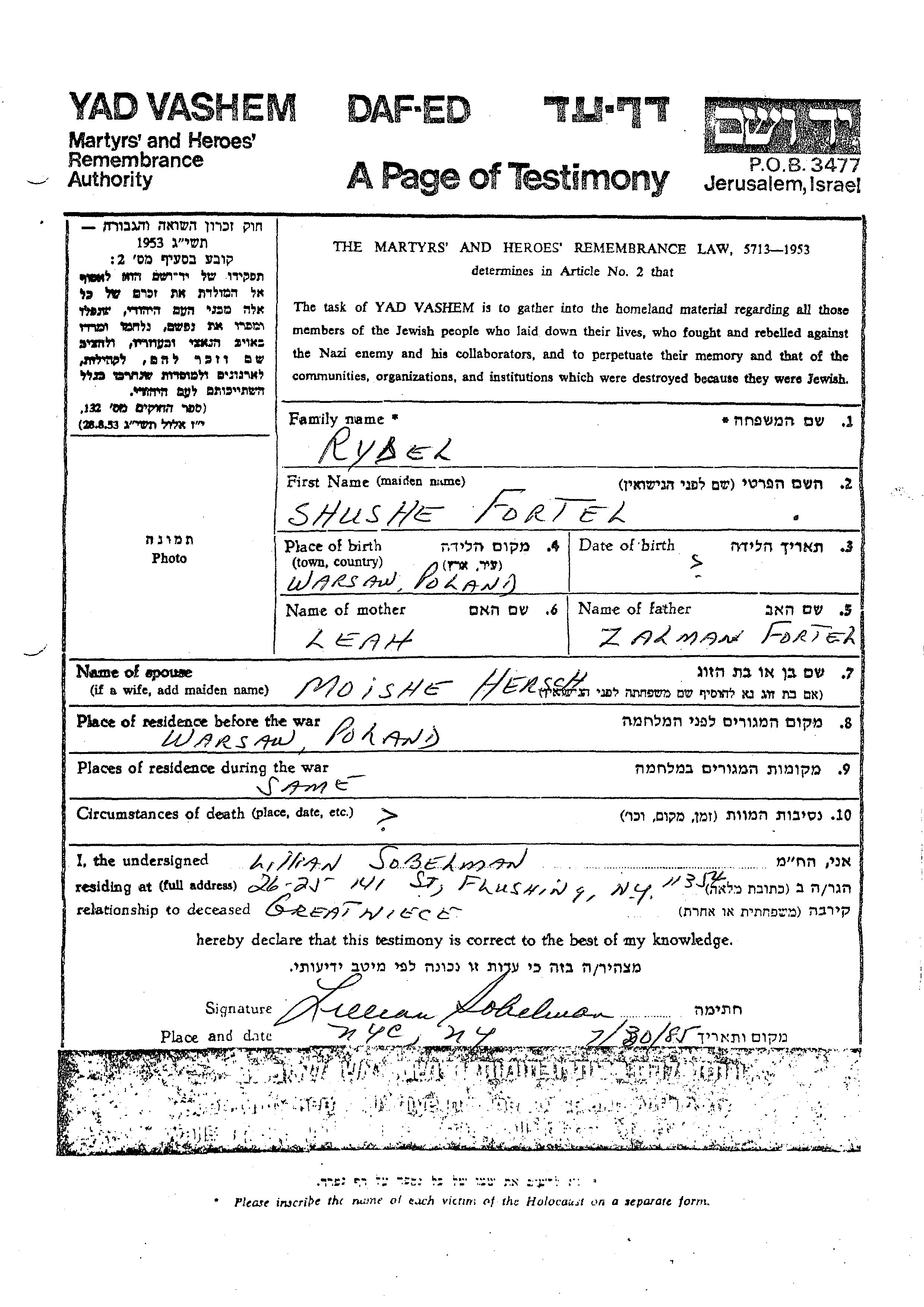 Shushe Rydel, geb. Fortel wurde in Warsaw, Polen geboren. Sie war die Tochter von Zalman und Leah. Sie war mit Moishe Hersch Verheiratet. Vor dem Zweiten Weltkrieg lebte sie in Warsaw, Polen. Während des Krieges war sie in Warsaw, Polen.