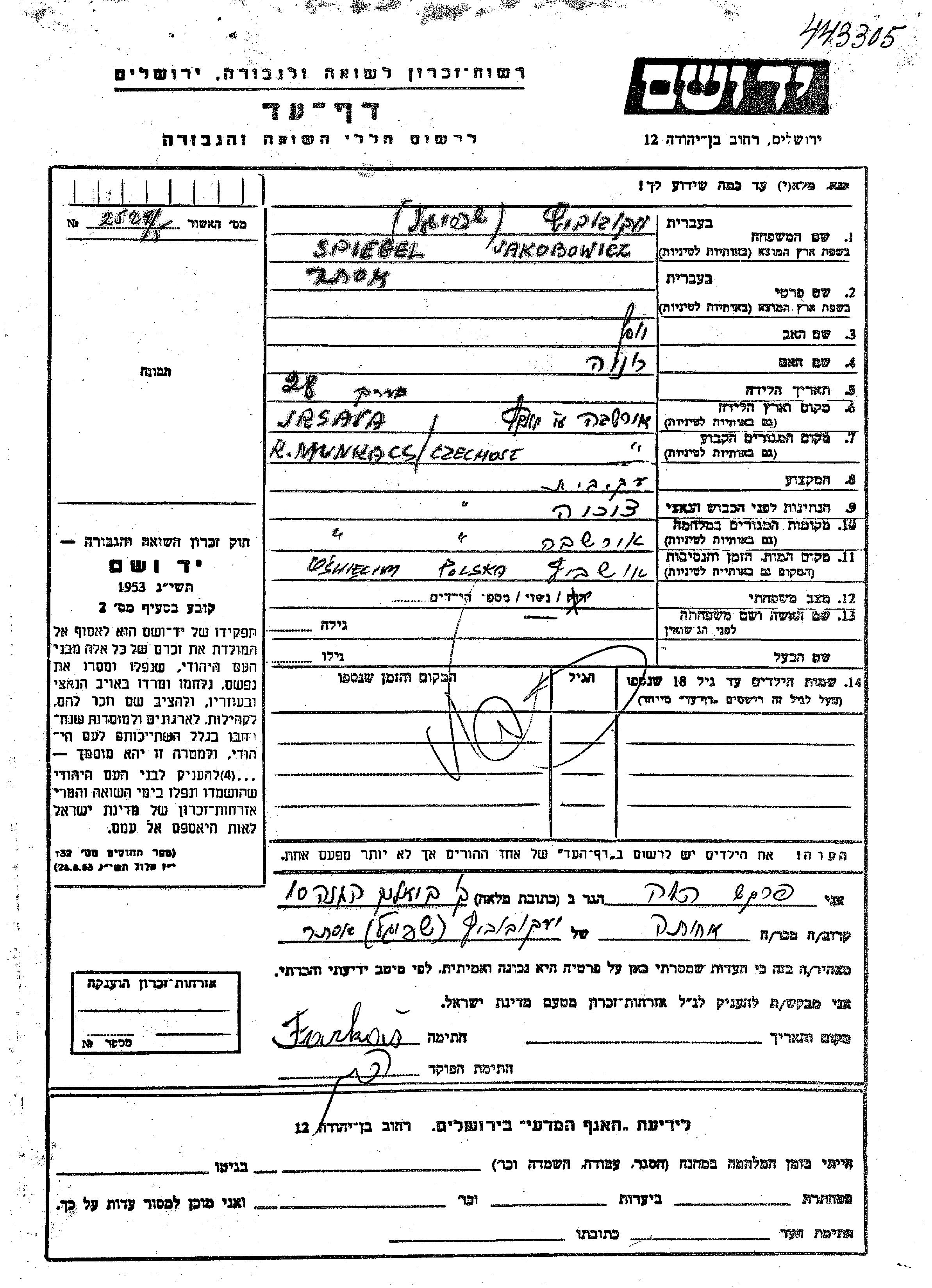 Ester Jakobowicz, geb. Spiegel wurde in Irsava, Tschechoslowakei geboren. Sie war die Tochter von Yosef und Rina. Sie war Hausfrau und Verheiratet. Vor dem Zweiten Weltkrieg lebte sie in Munkacs, Tschechoslowakei. Während des Krieges war sie in Munkacs, Tschechoslowakei.