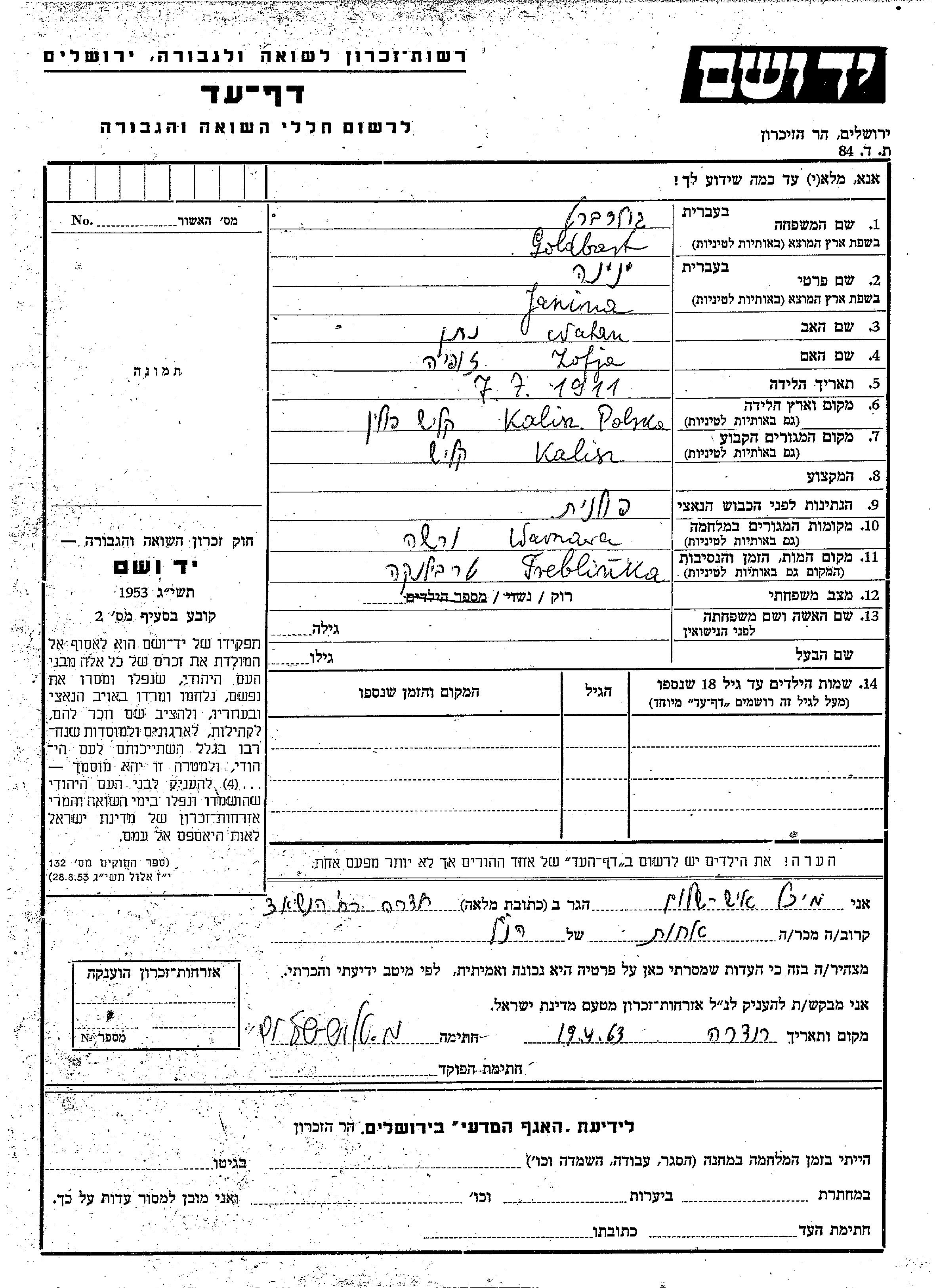 Janina Goldbart wurde im Jahr 1911 in Kalisz, Polen geboren. Sie war die Tochter von Natan und Zofja. Sie war Ledig. Vor dem Zweiten Weltkrieg lebte sie in Kalisz, Polen. Während des Krieges war sie in Warsaw, Polen.