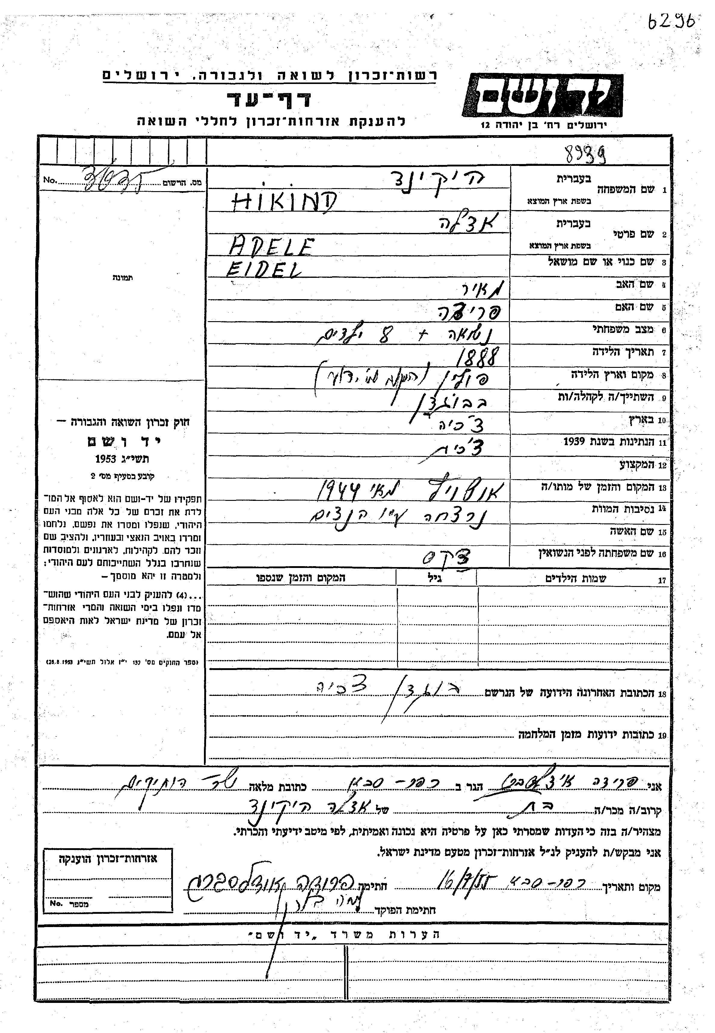 Adele Hikind, geb. Chaks wurde im Jahr 1888 in Polen geboren. Sie war die Tochter von Meir und Frida. Sie war Verheiratet. Vor dem Zweiten Weltkrieg lebte sie in Bogdan, Tschechoslowakei.