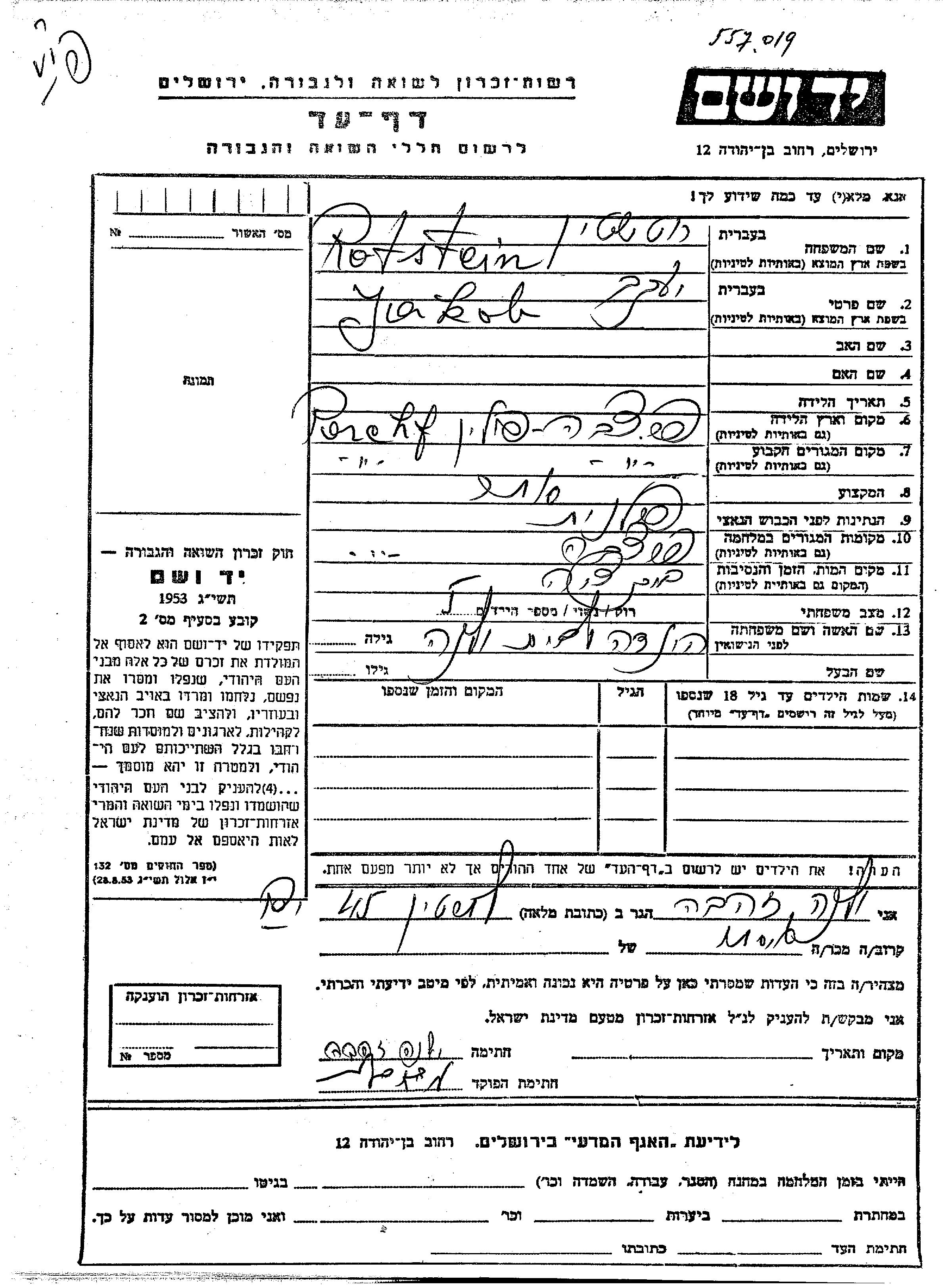 Jakob Rotstein wurde in Parczew, Polen geboren. Er war Kaufmann/-frau und mit Hinda, geb. Valne Verheiratet. Vor dem Zweiten Weltkrieg lebte er in Parczew, Polen. Während des Krieges war er in Parczew, Polen.